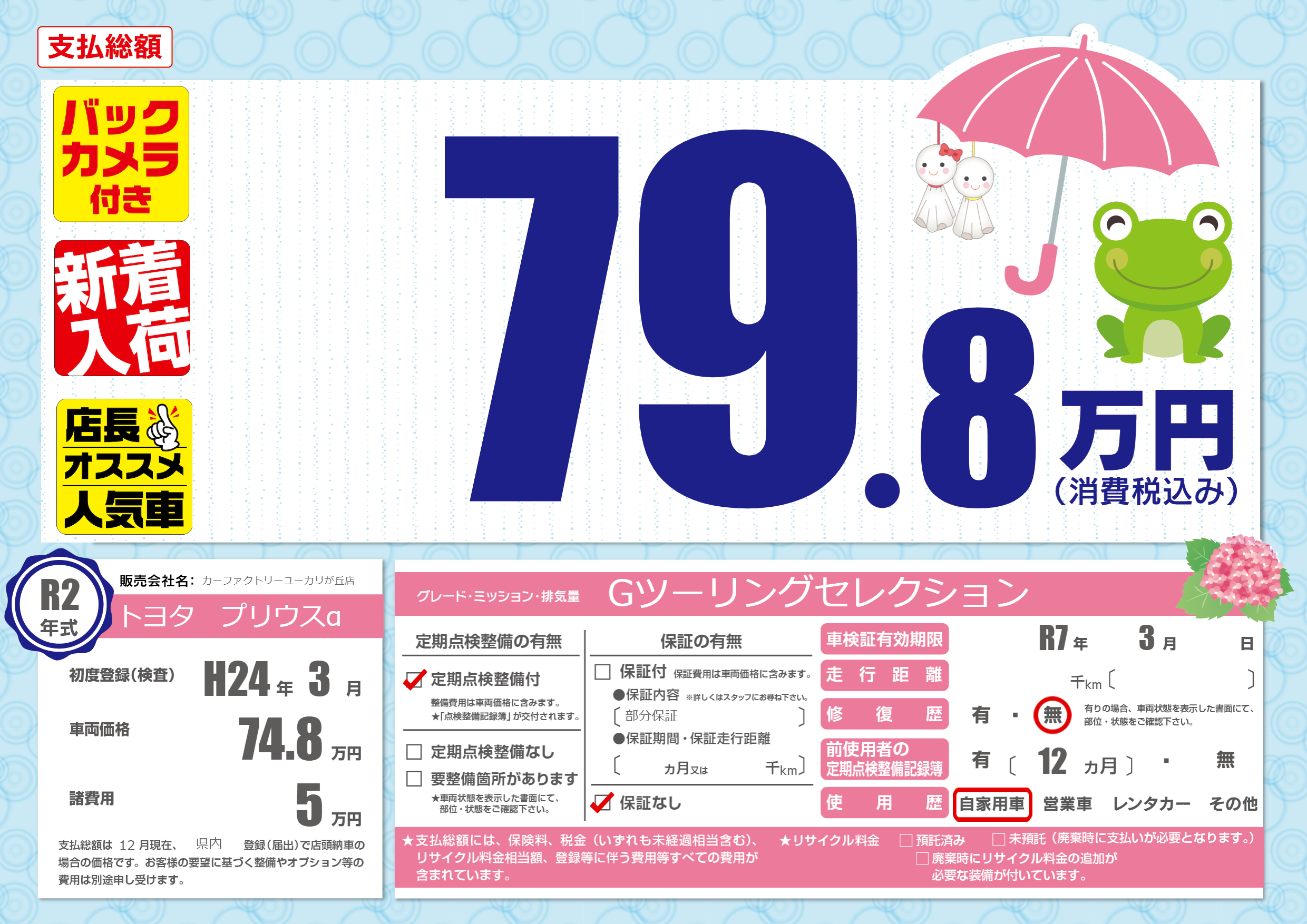 | 車名 | トヨタ プリウスα | グレード ミッション 排気量 |