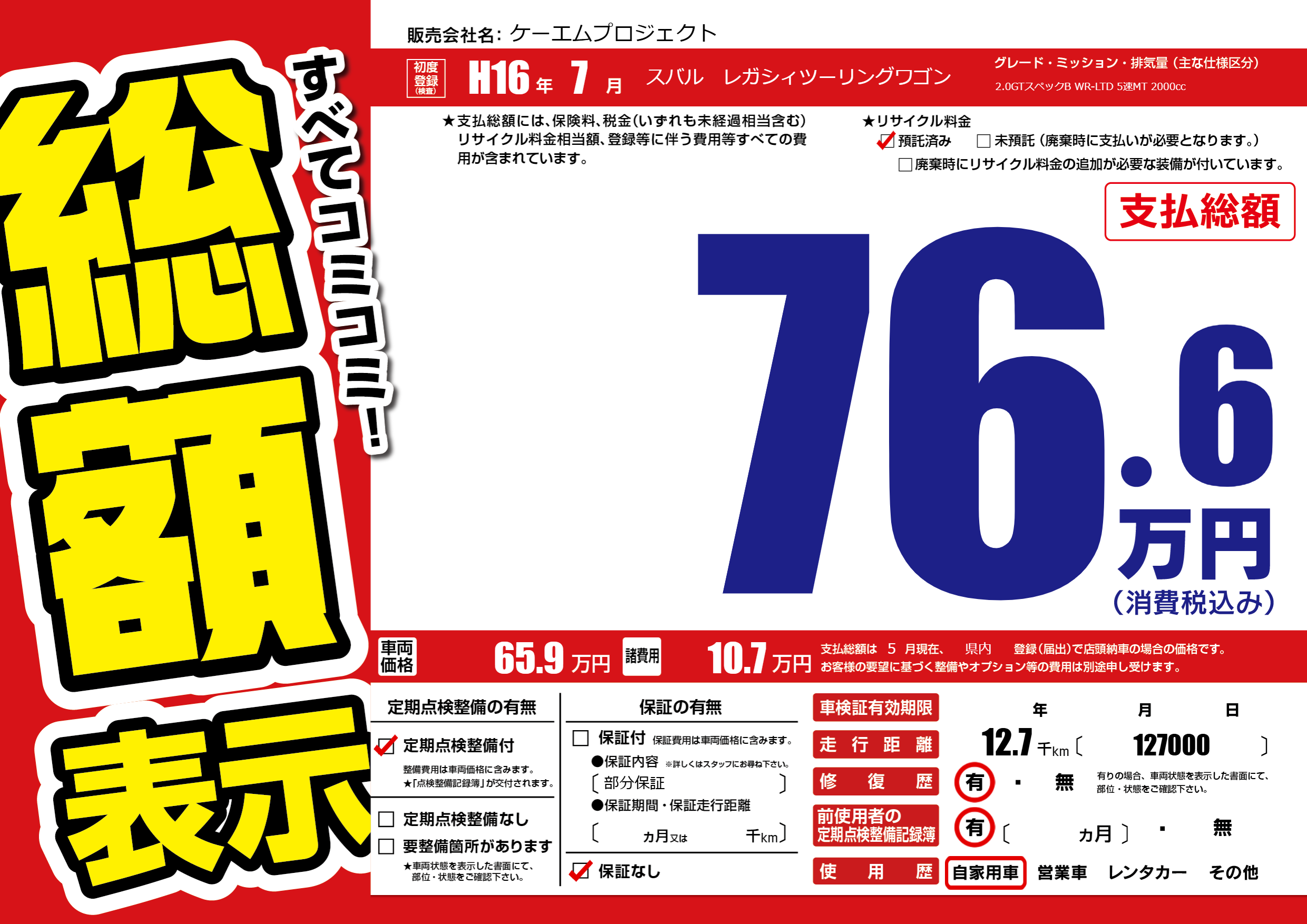 | 車名 | スバル レガシィツーリングワゴン | グレード ミッション 排気量 |