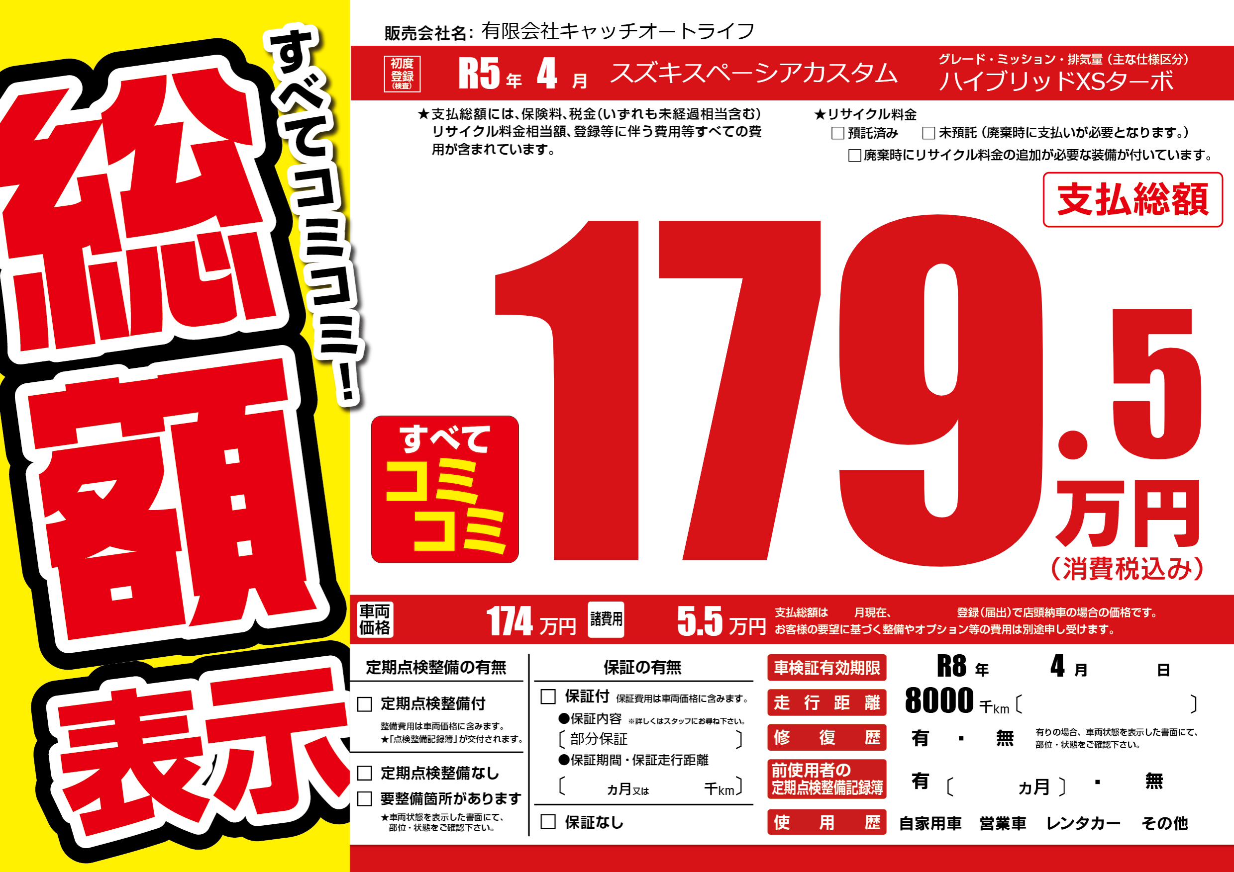 | 車名 | スズキスペーシアカスタム | グレード ミッション 排気量 |