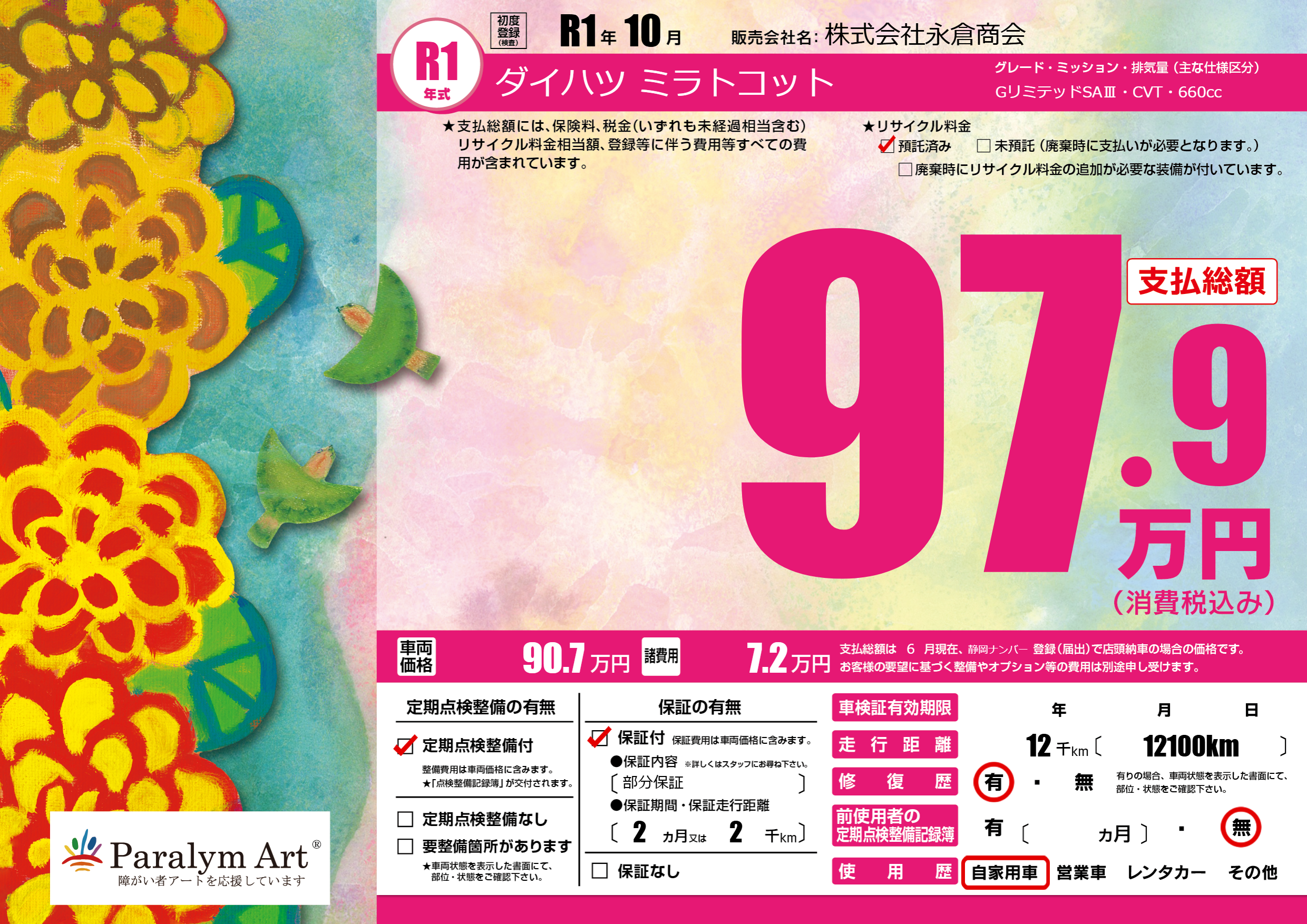 | 車名 | ダイハツ ミラトコット | グレード ミッション 排気量 |
