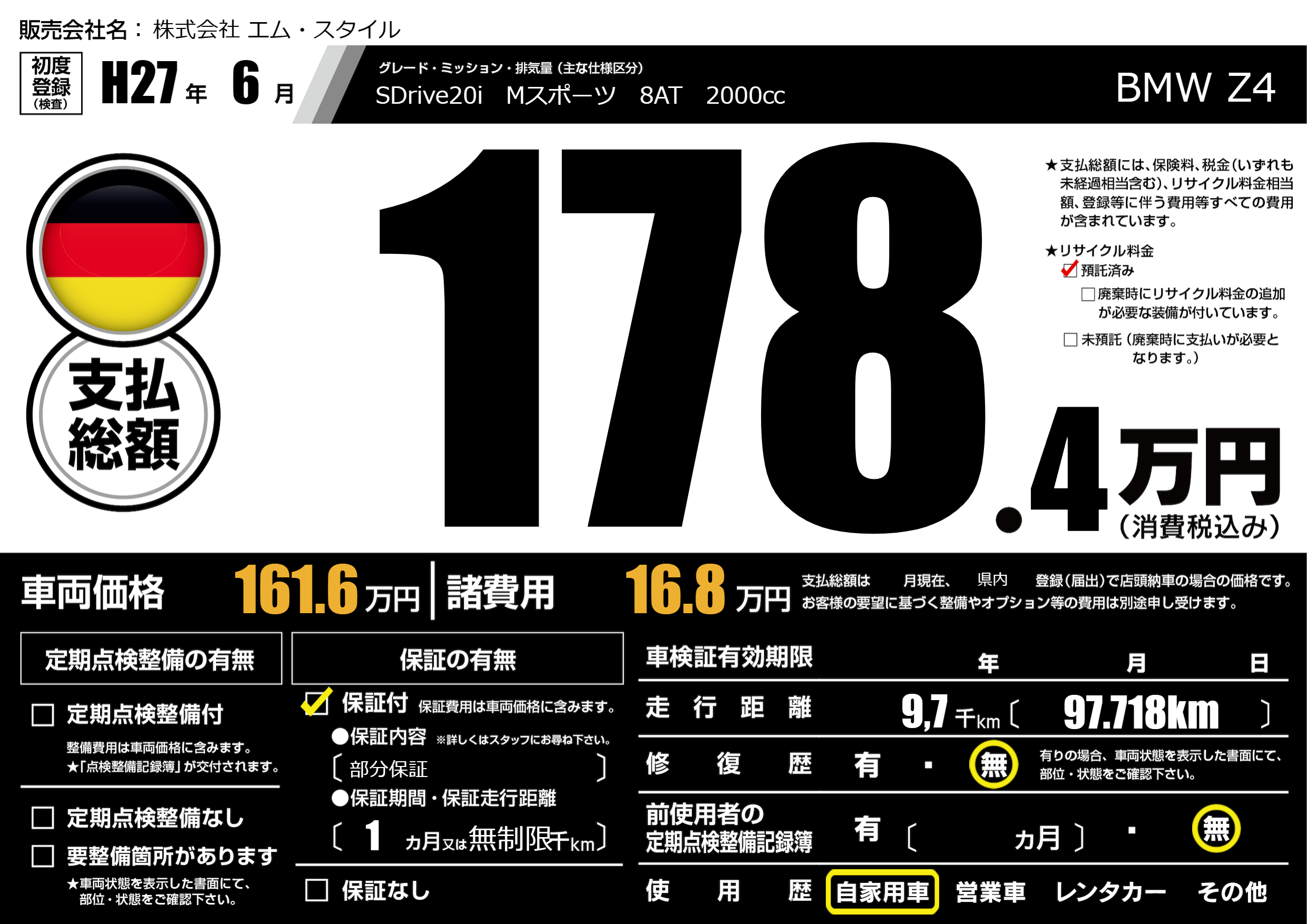 | 車名 | BMW Z4 | グレード ミッション 排気量 |