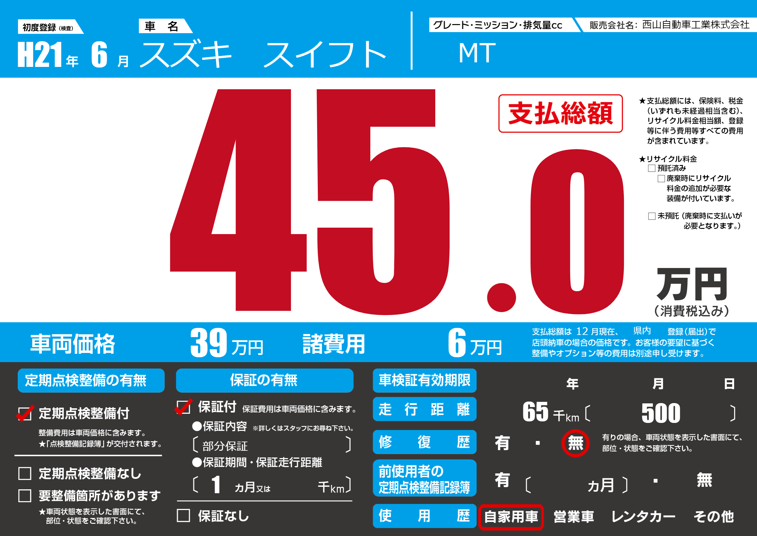 | 走行キロ | 6.5万km | 初年度登録 | H21年6月 |