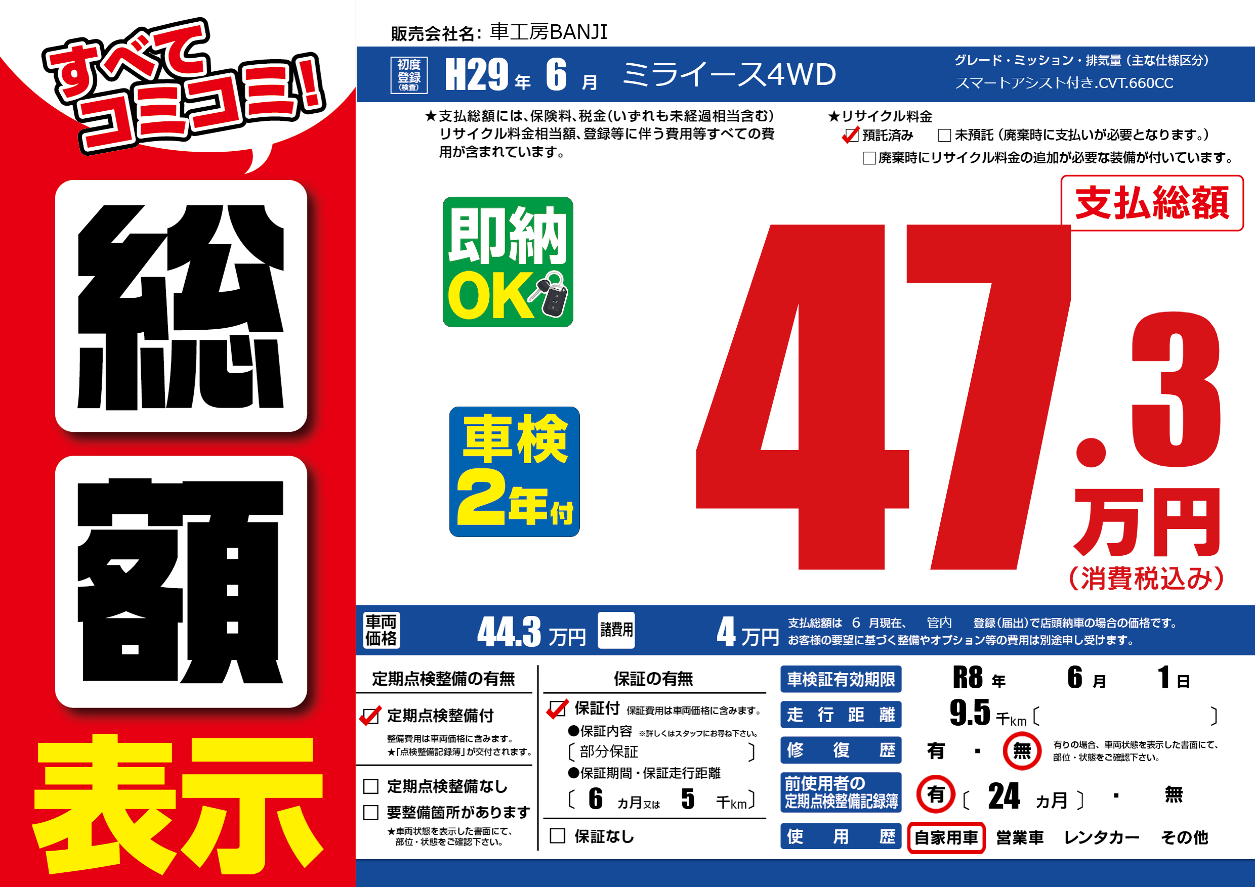 | 車名 | ミライース4WD | グレード ミッション 排気量 |