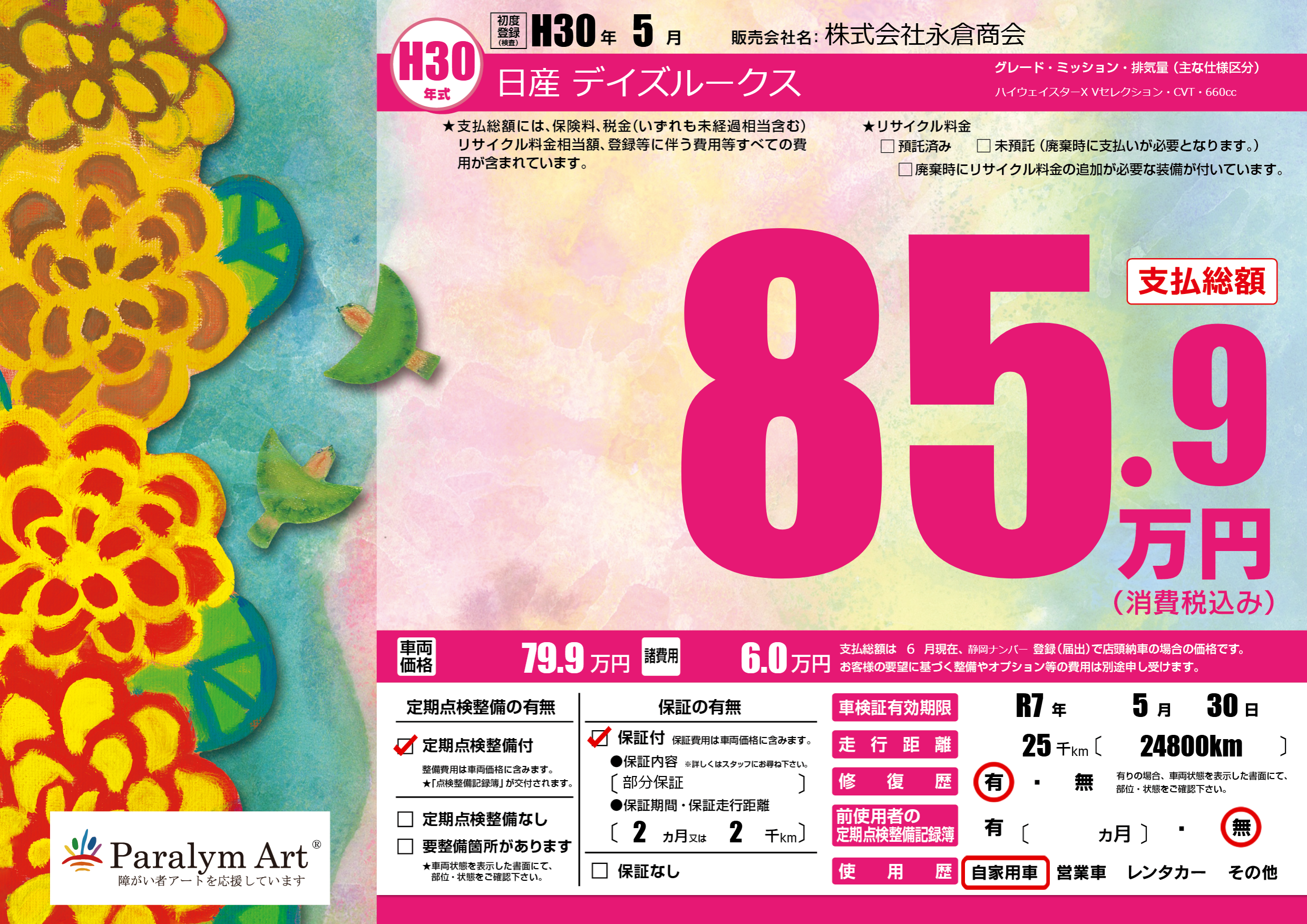 | 車名 | 日産 デイズルークス | グレード ミッション 排気量 |