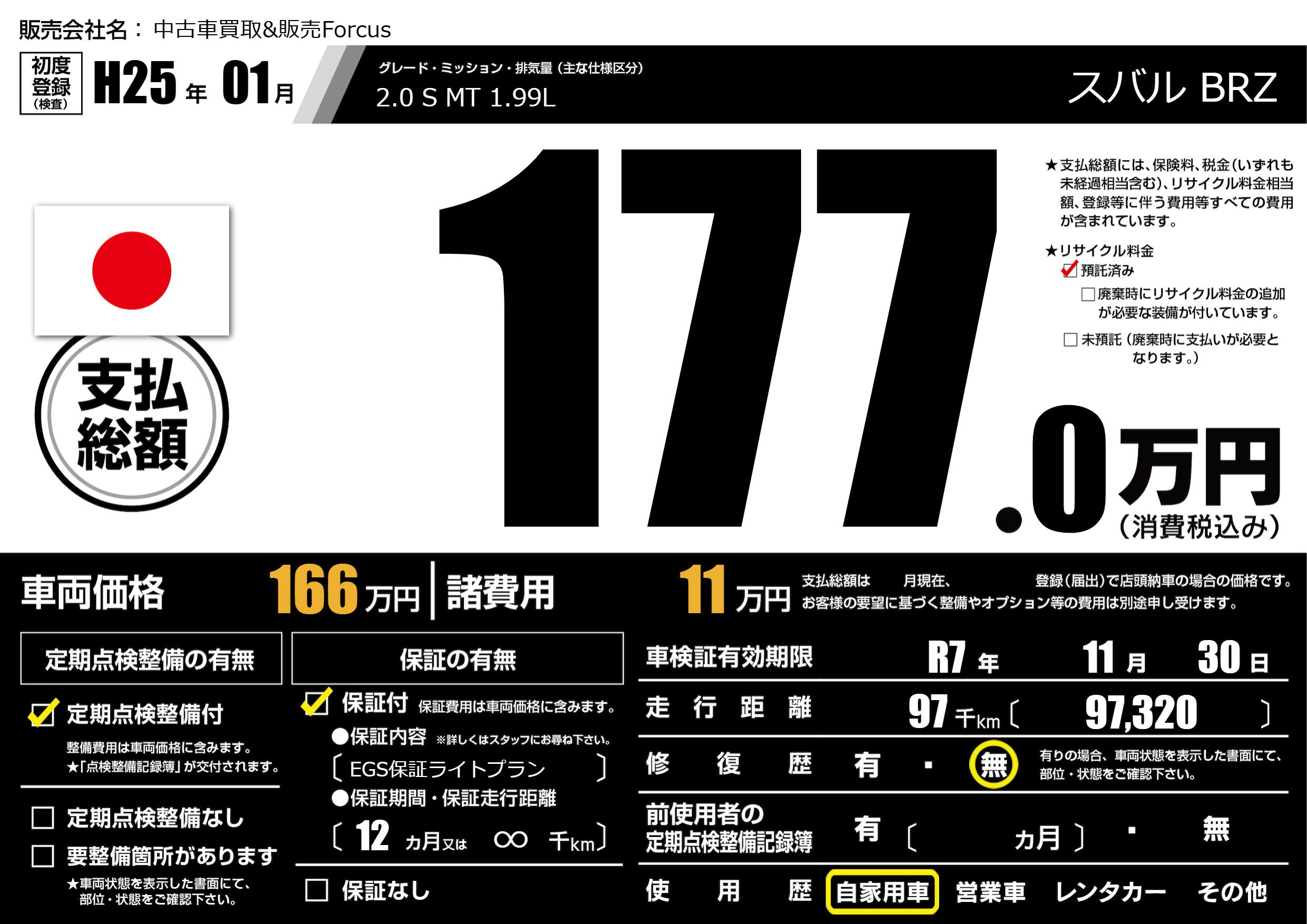 | 車名 | スバル BRZ | グレード ミッション 排気量 |