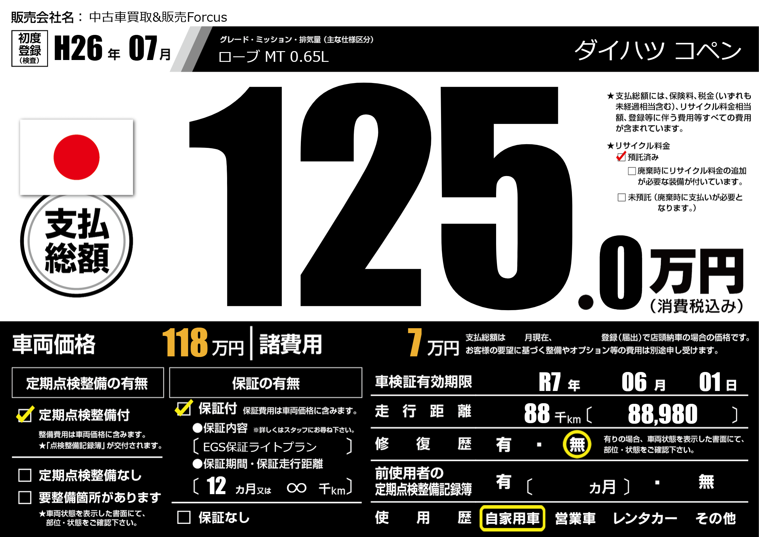 | 車名 | ダイハツ コペン | グレード ミッション 排気量 |