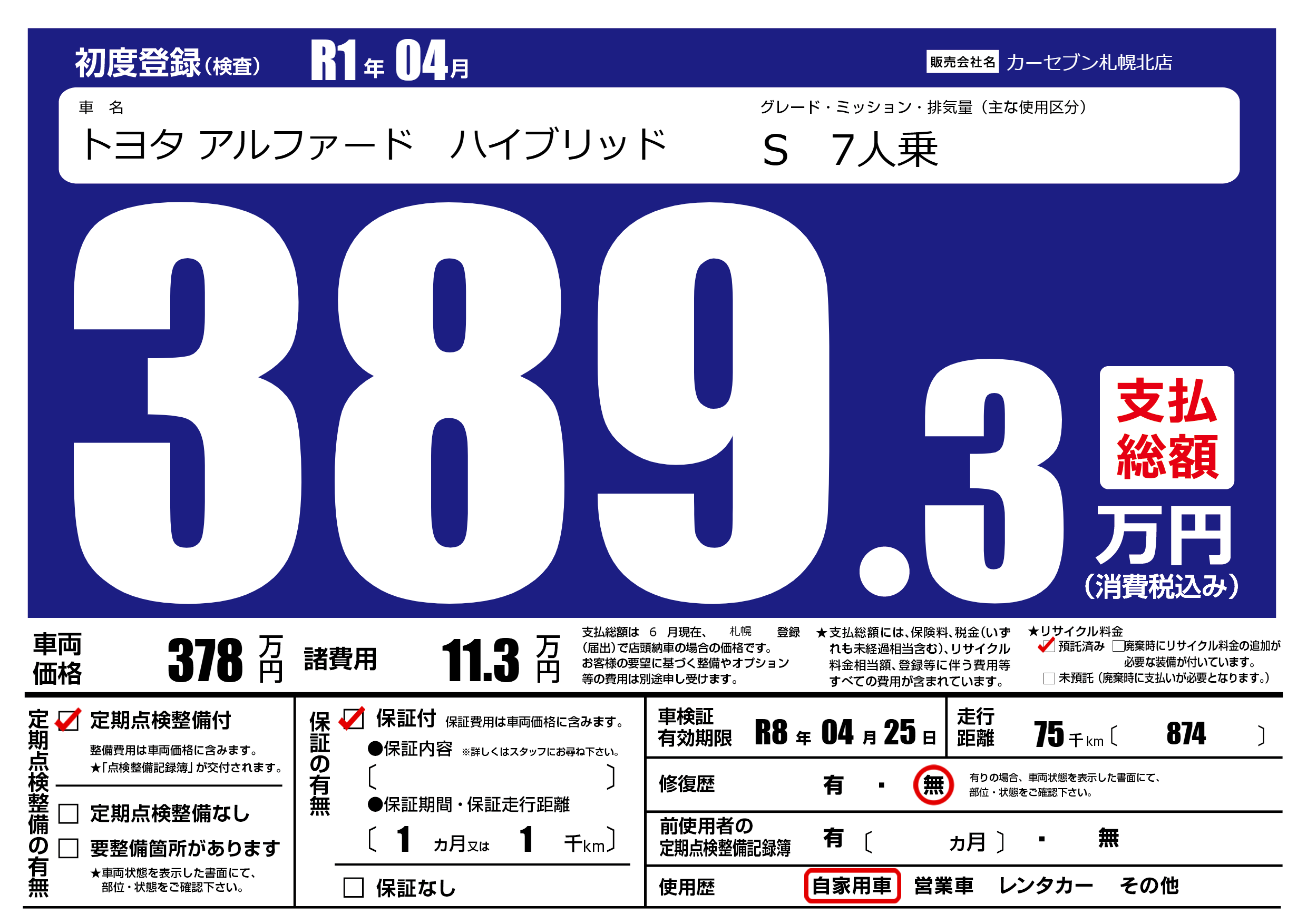 | 走行キロ | 7.5万km | 初年度登録 | R1年04月 |