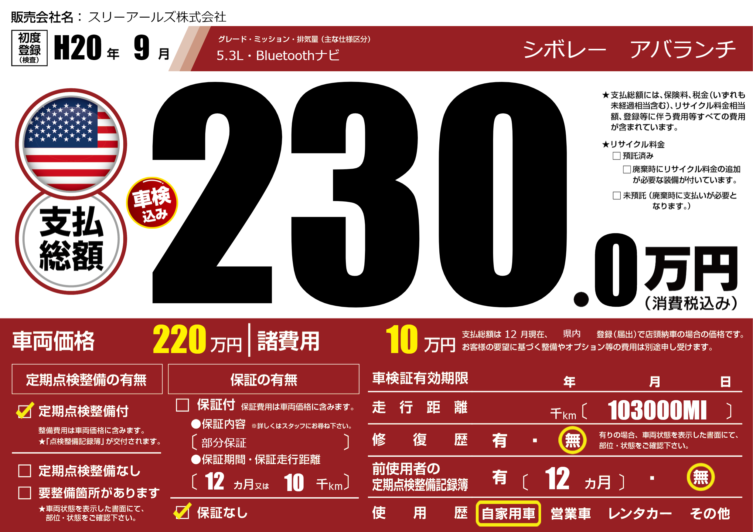 | 車名 | シボレー アバランチ | グレード ミッション 排気量 |
