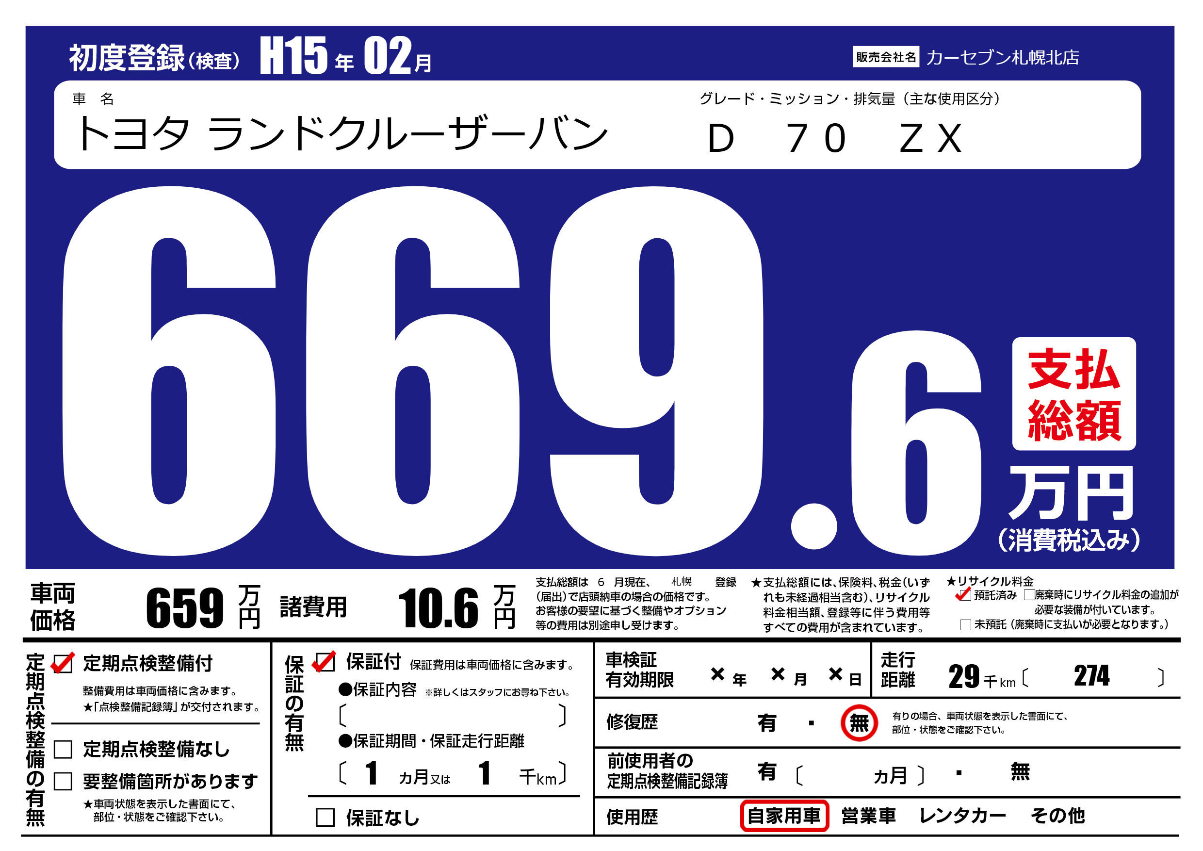 | 走行キロ | 2.9万km | 初年度登録 | H15年02月 |