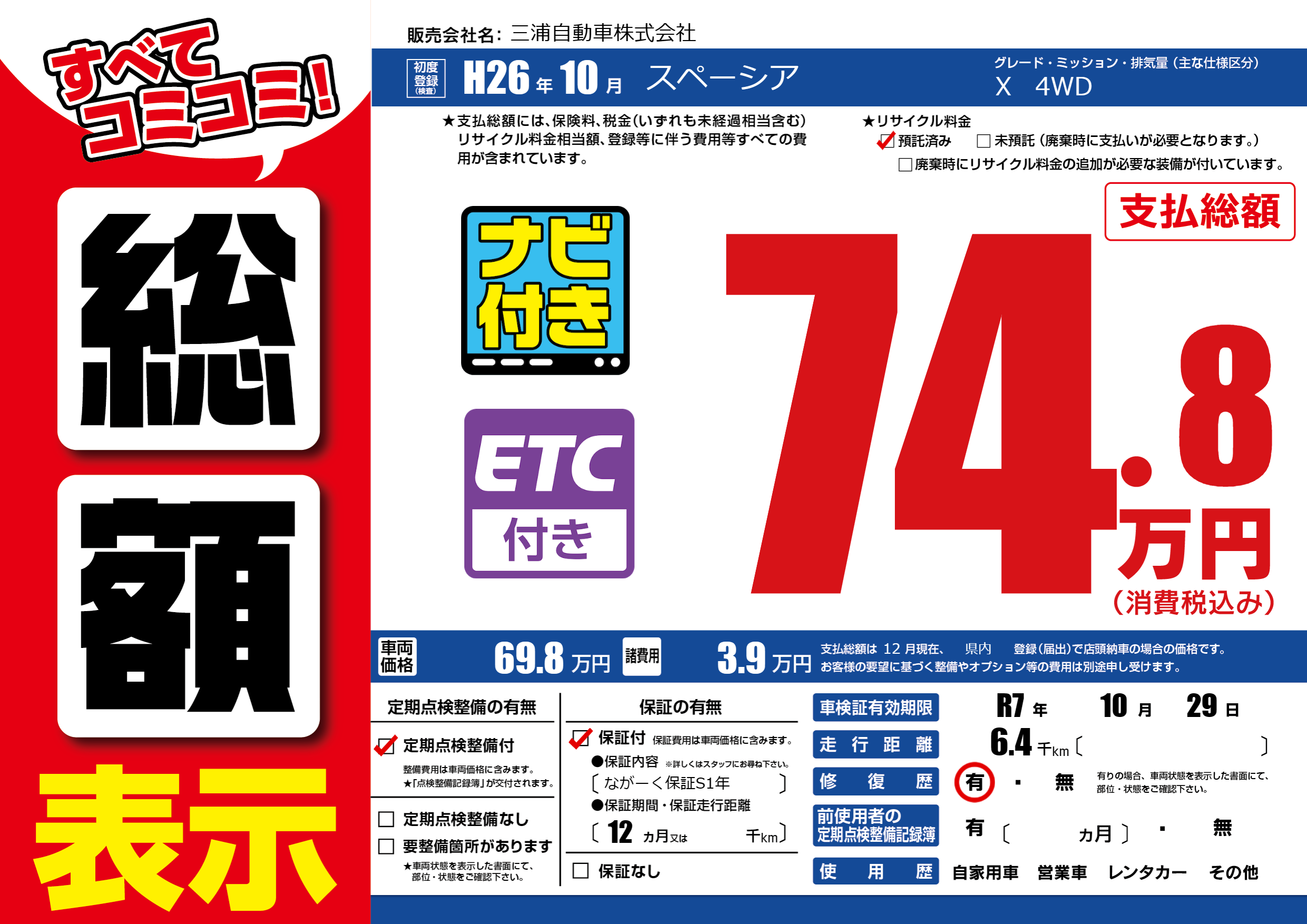 | 車検制限 | R7年 10月 29日 | ||