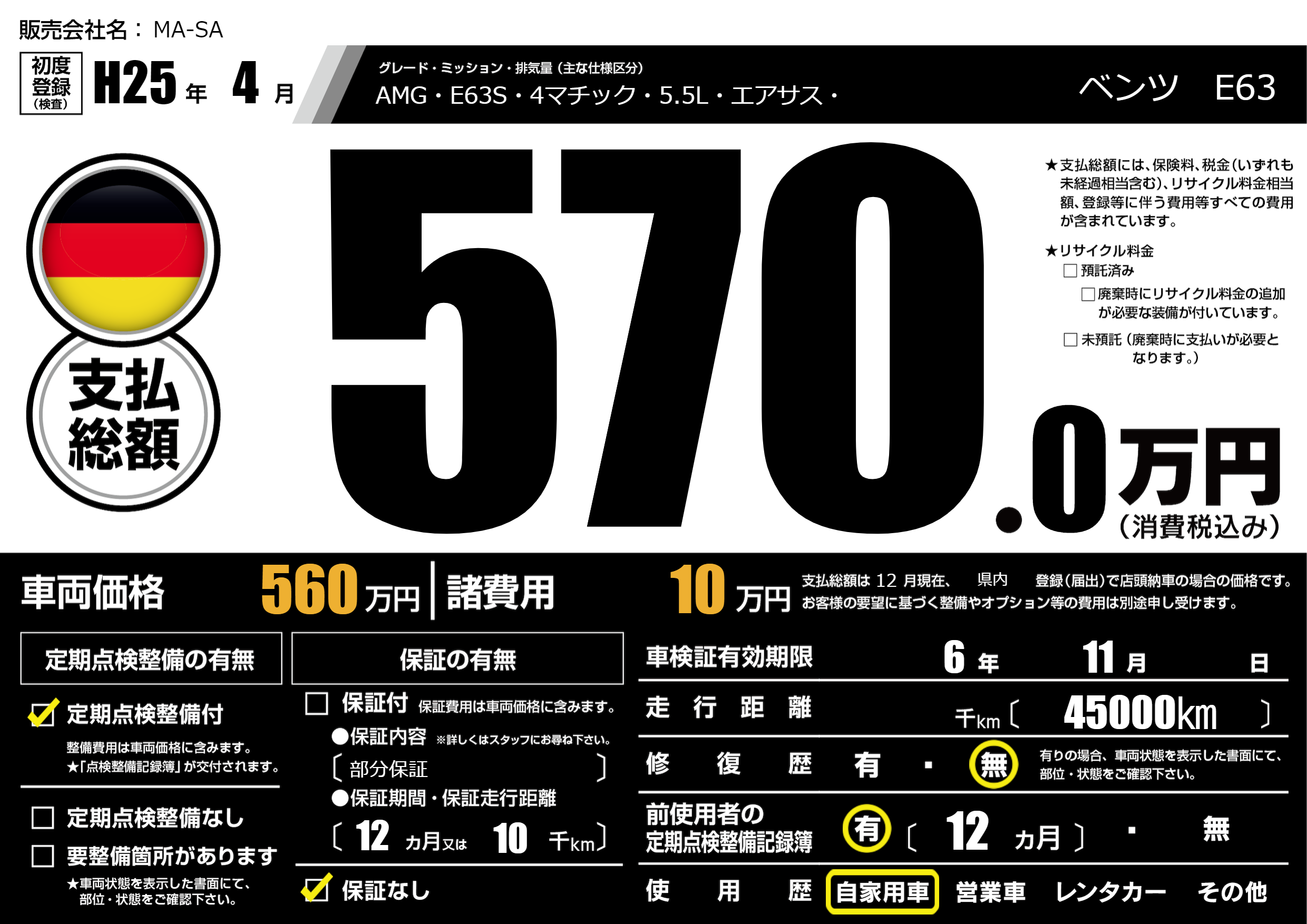| 車名 | ベンツ E63 | グレード ミッション 排気量 |