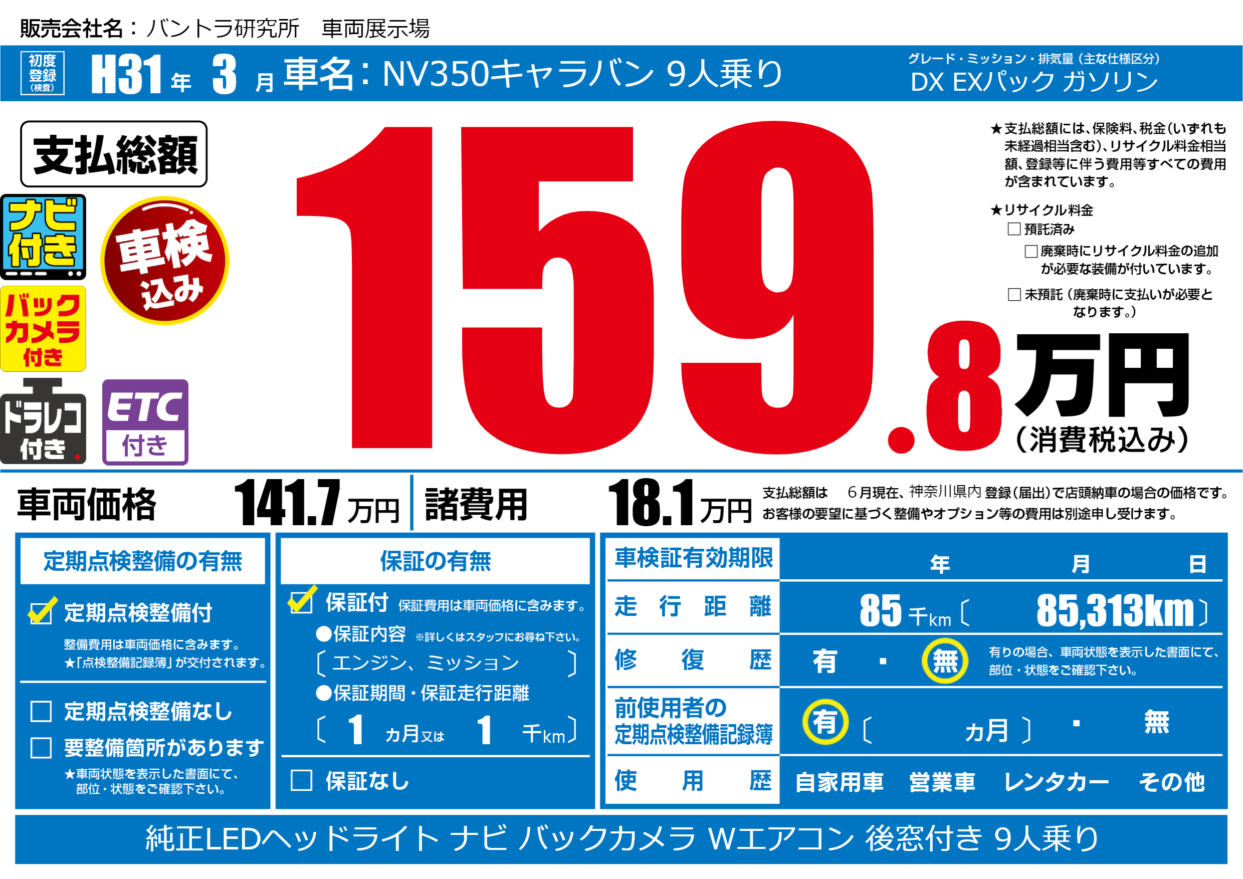 | 車名 | NV350キャラバン 9人乗り | グレード ミッション 排気量 |