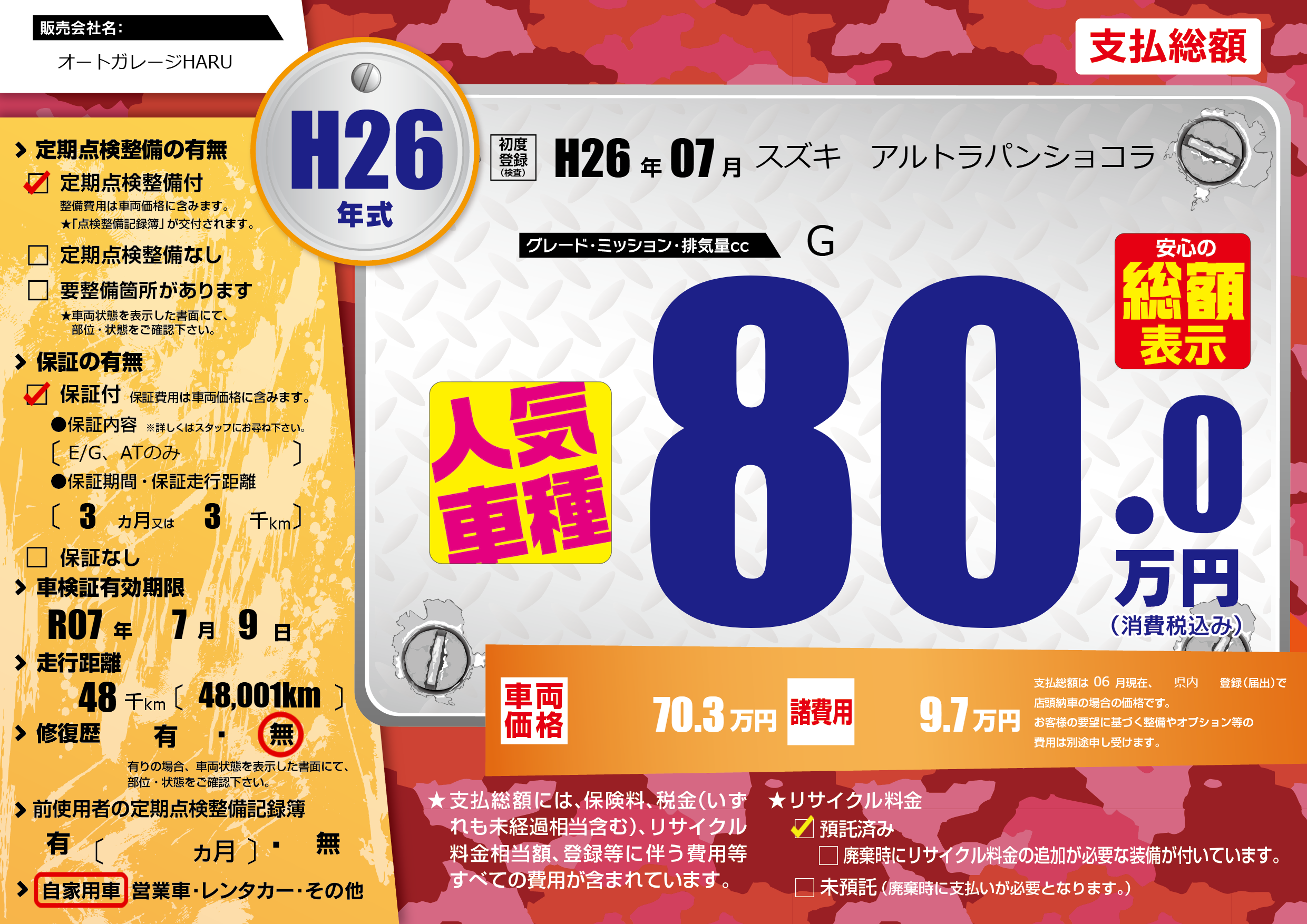 | 車名 | スズキ アルトラパンショコラ | グレード ミッション 排気量 |