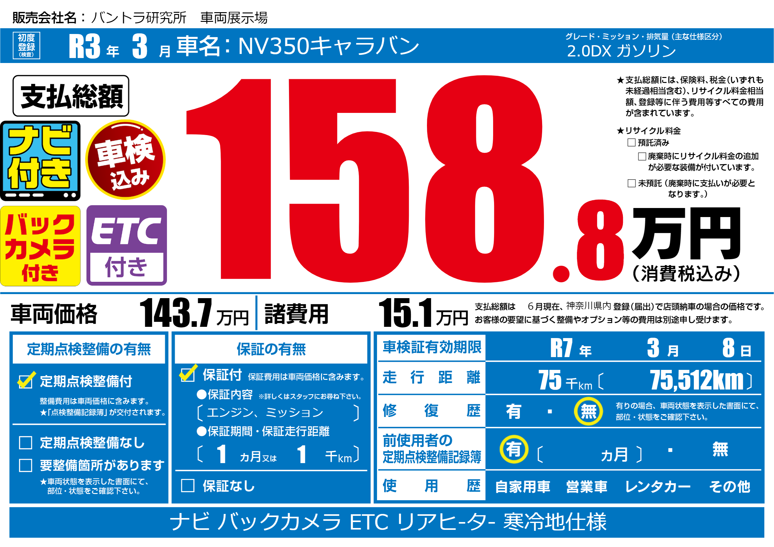 | 車名 | NV350キャラバン | グレード ミッション 排気量 |
