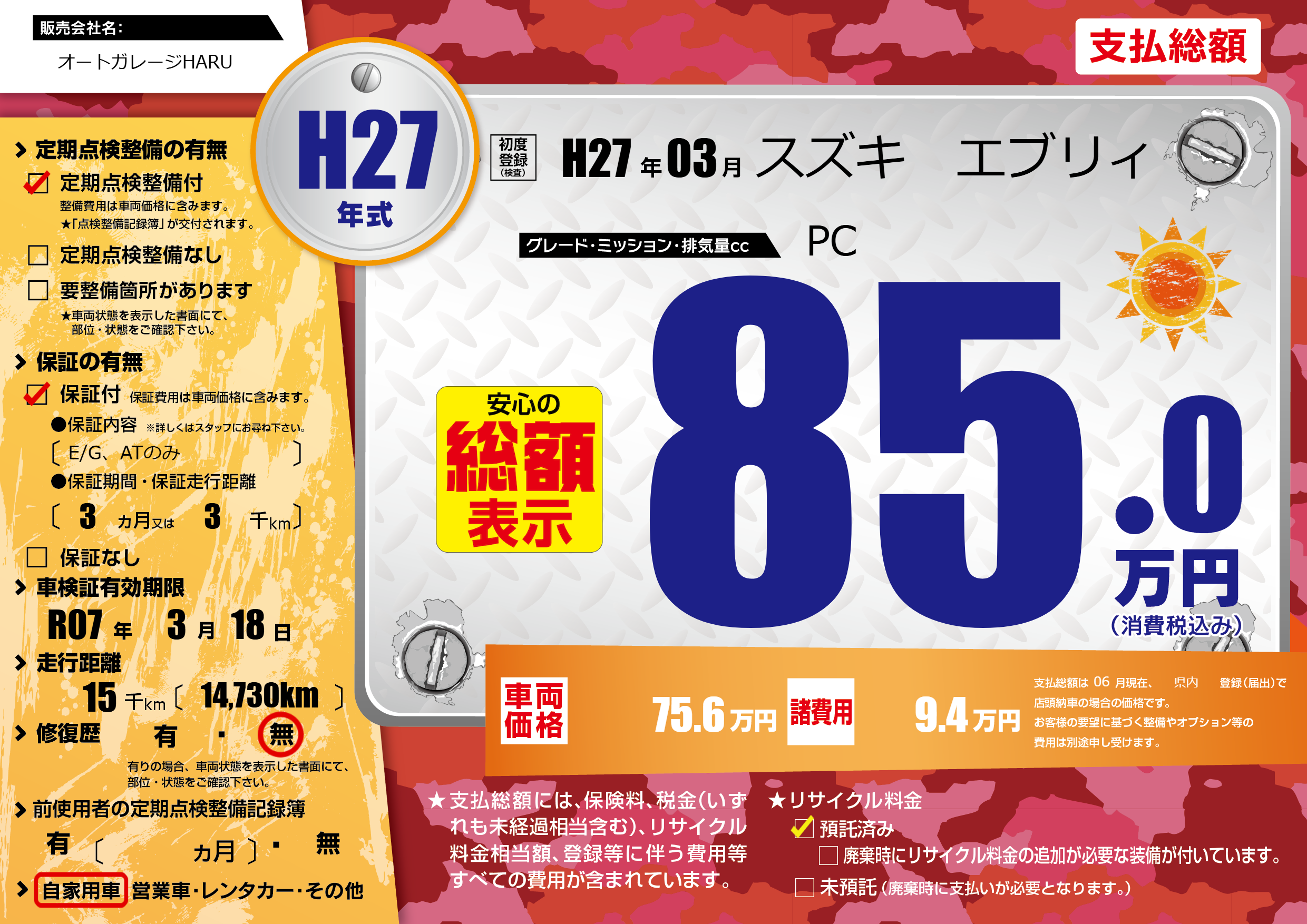 | 車名 | スズキ エブリィ | グレード ミッション 排気量 |