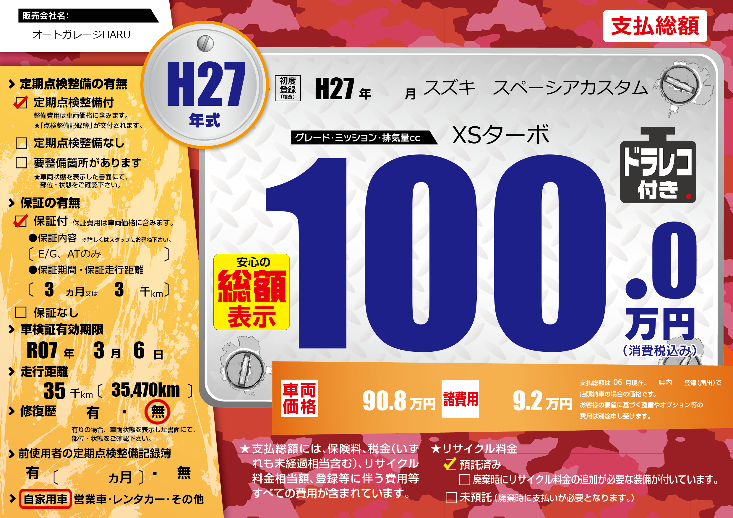 | 車名 | スズキ スペーシアカスタム | グレード ミッション 排気量 |