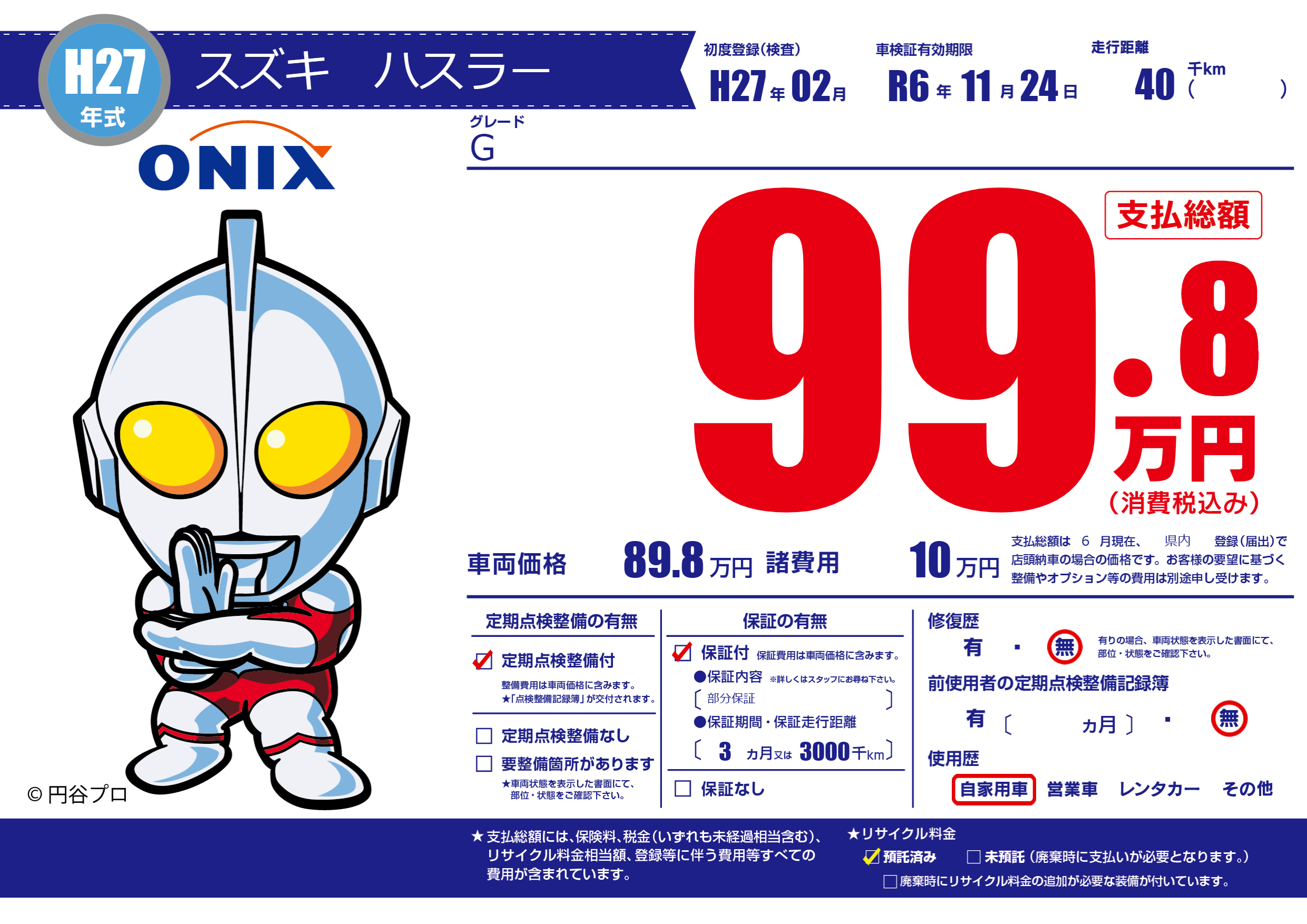 | 車名 | スズキ ハスラー | グレード ミッション 排気量 |