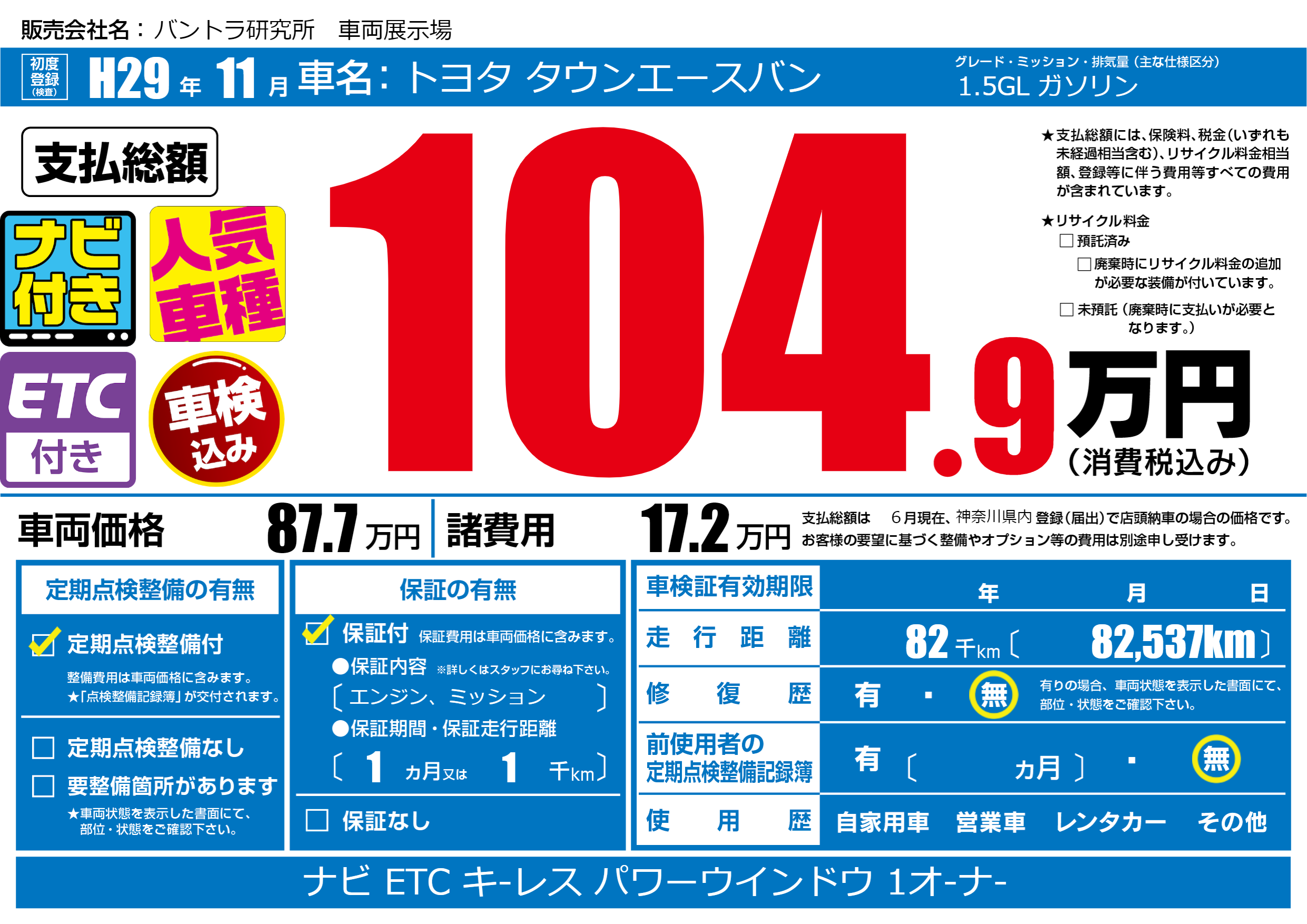 | 車名 | トヨタ タウンエースバン | グレード ミッション 排気量 |