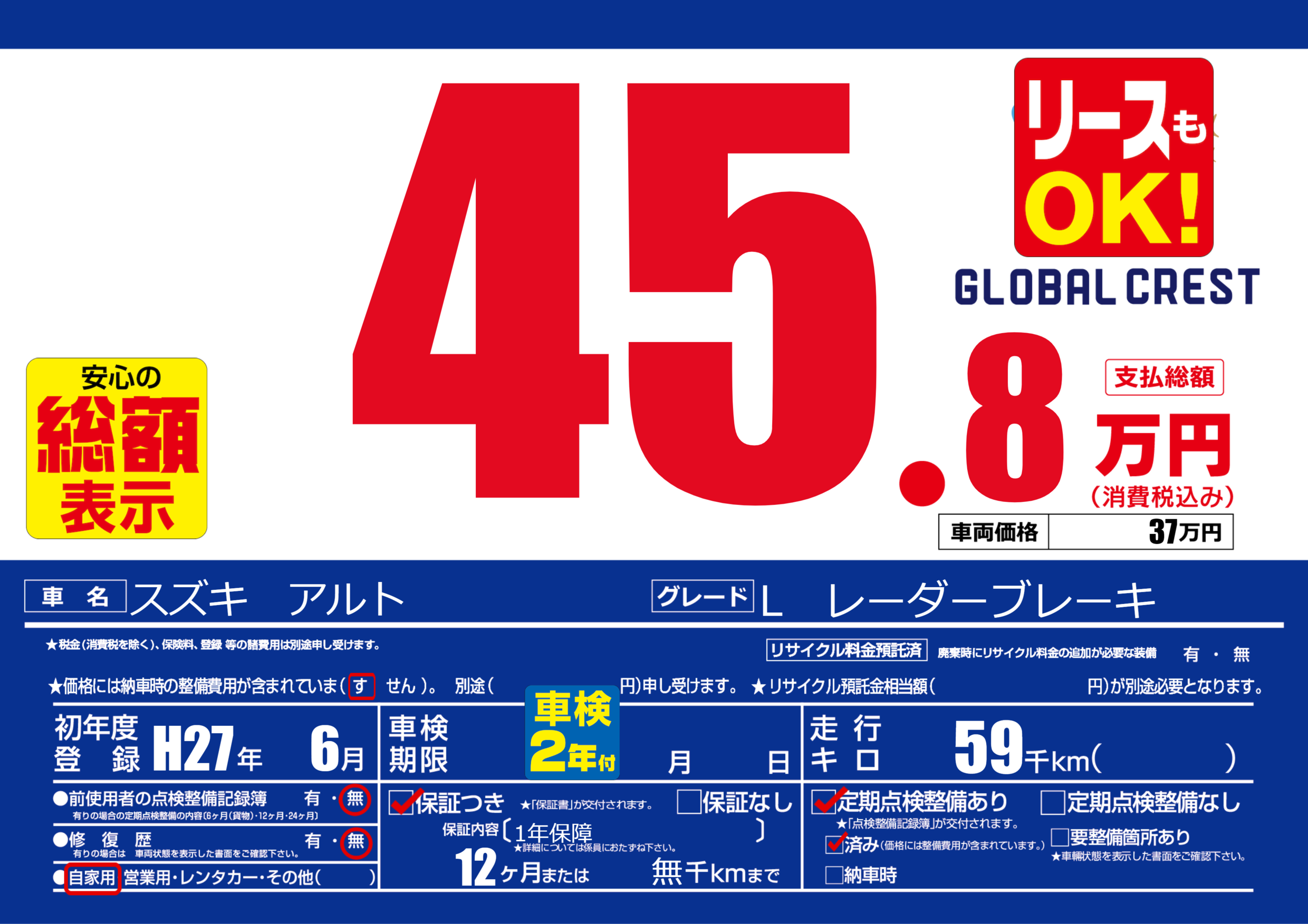 | 定期点検整備 | 定期点検整備あり 定期点検整備済み | ||