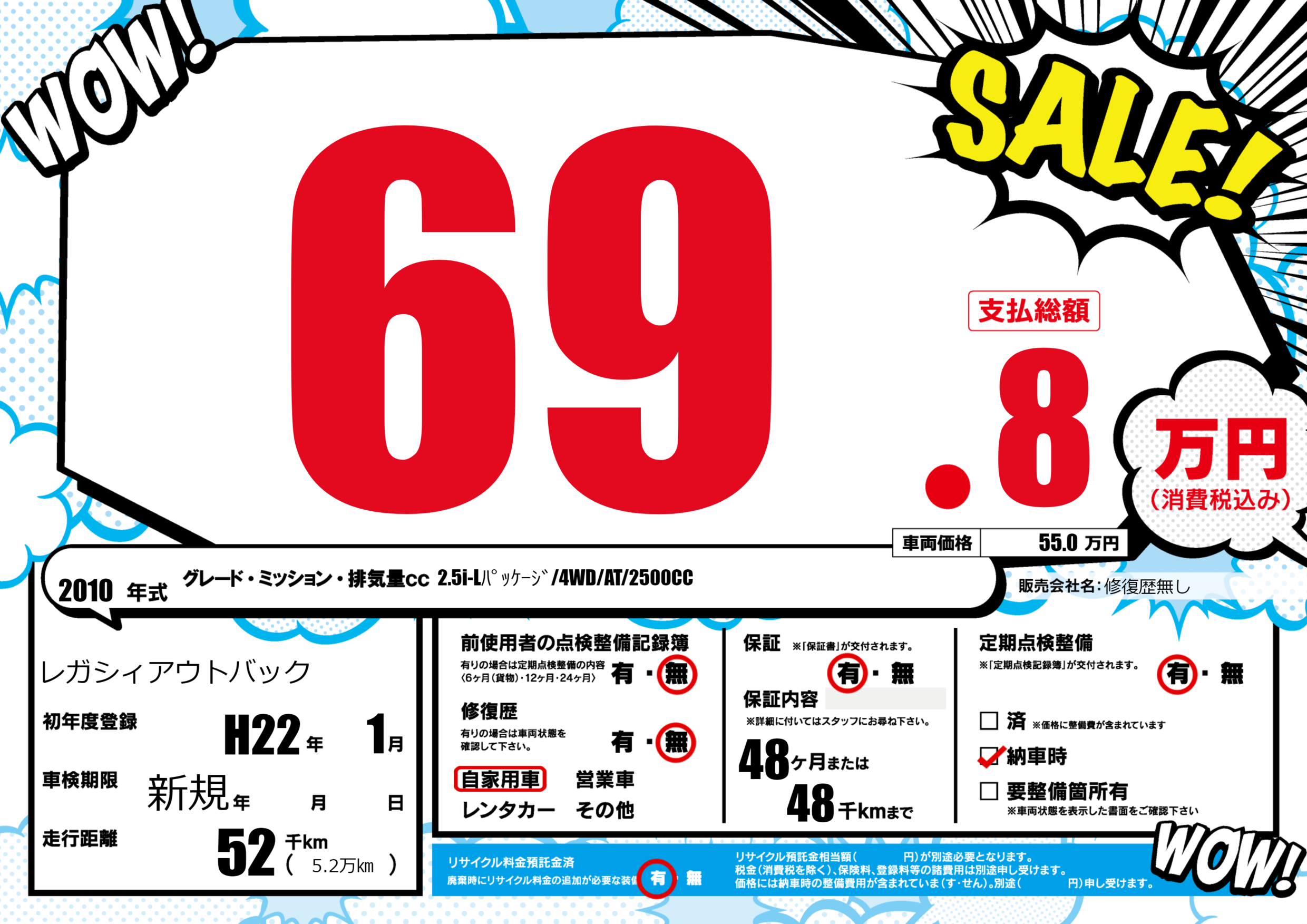 | 走行キロ | 5.2万km | 初年度登録 | H22年1月 |