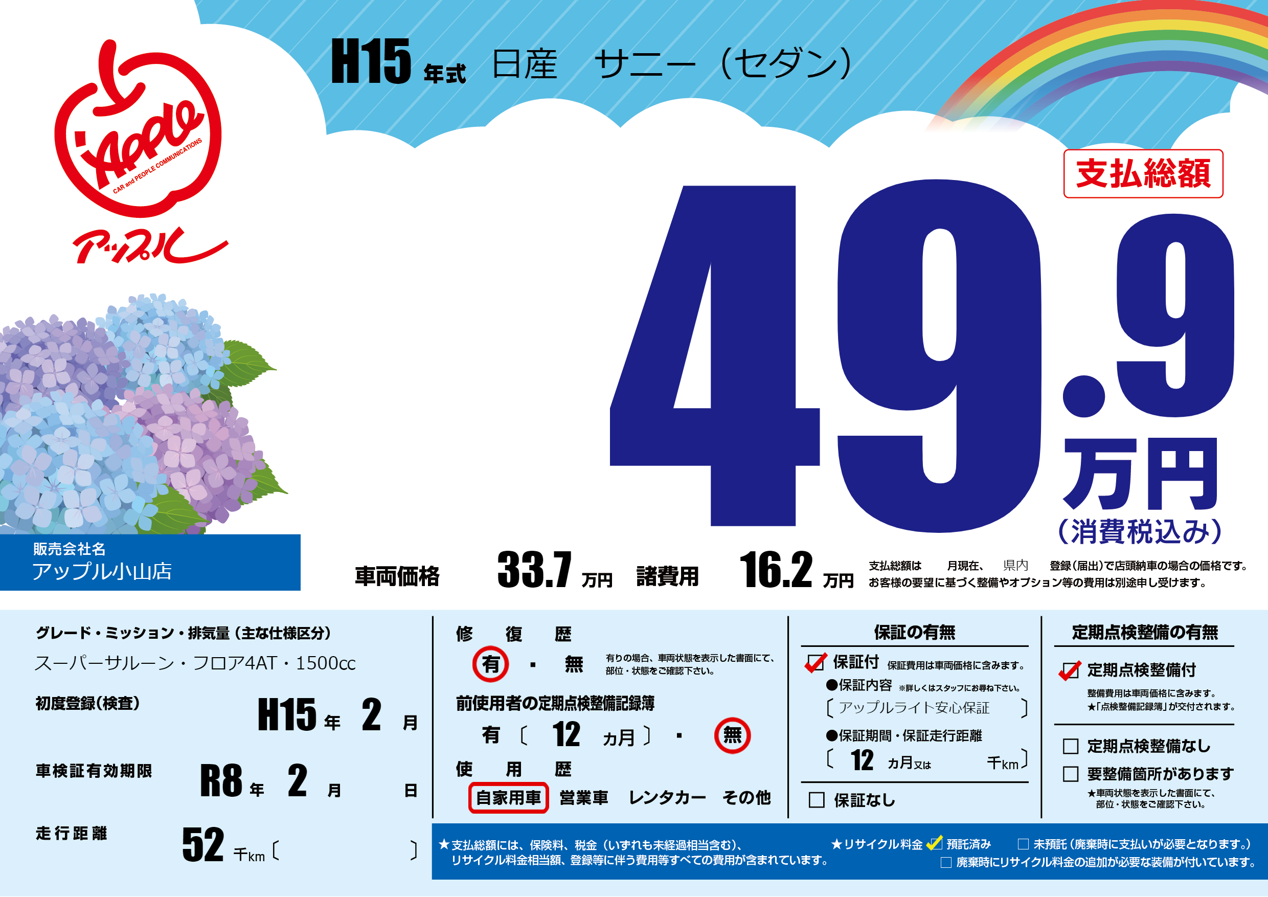 | 走行キロ | 5.2万km | 初年度登録 | H15年2月 |