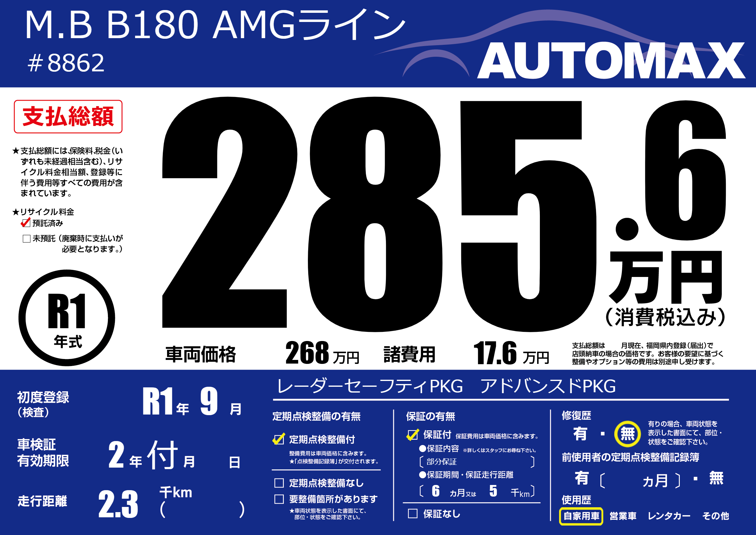 | 車名 | M.B B180 AMGライン | グレード ミッション 排気量 |