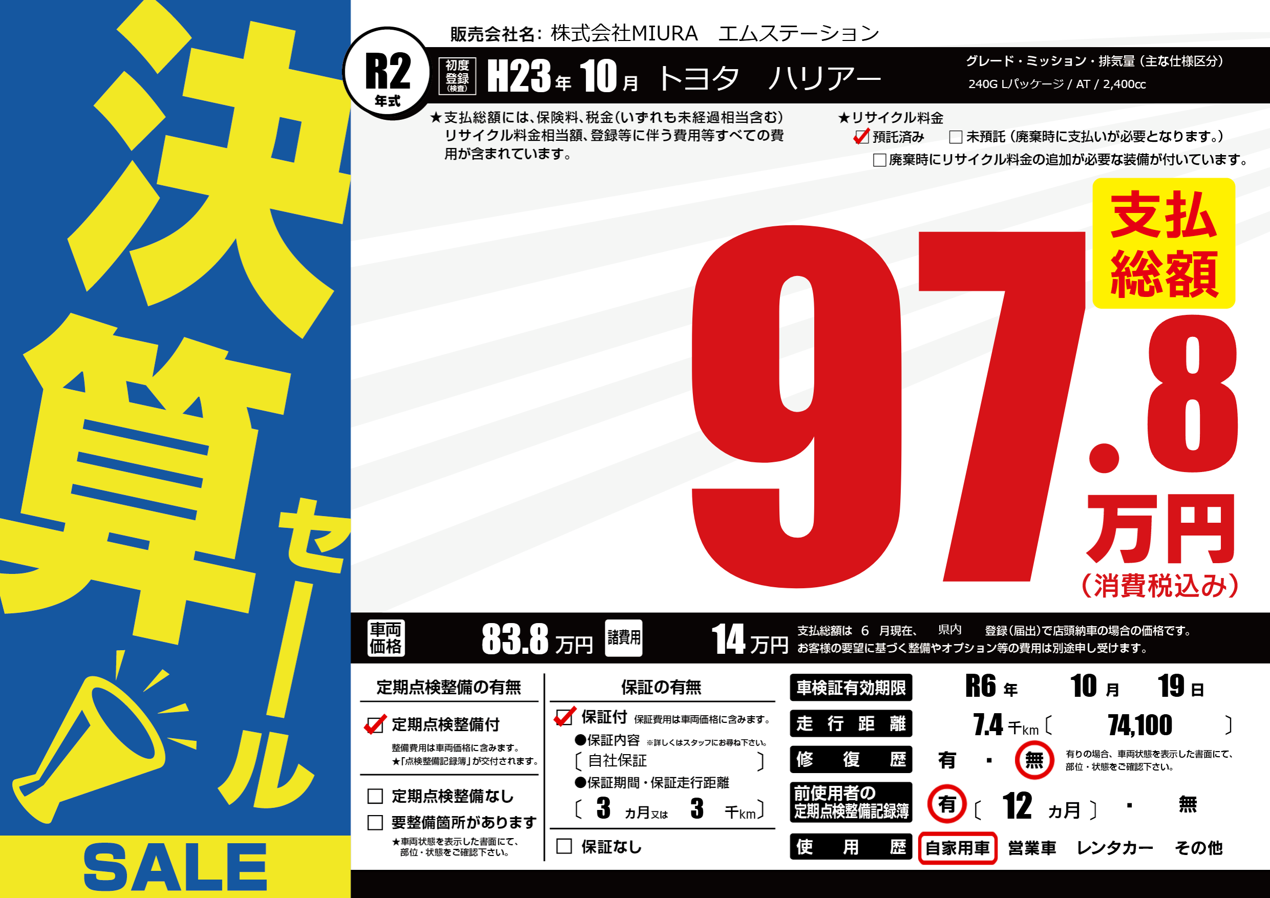 | 走行キロ | 0.7万km | 初年度登録 | H23年10月 |