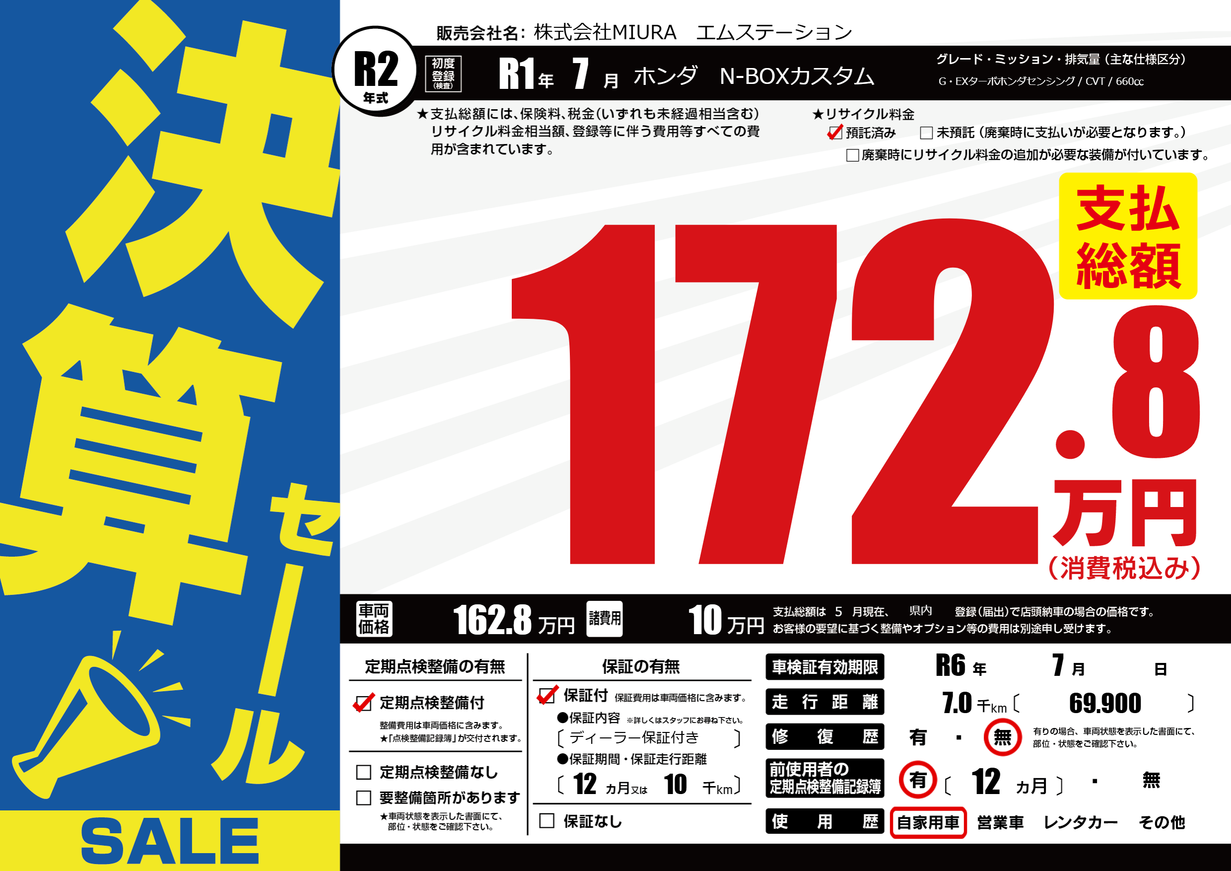 | 走行キロ | 0.7万km | 初年度登録 | R1年7月 |