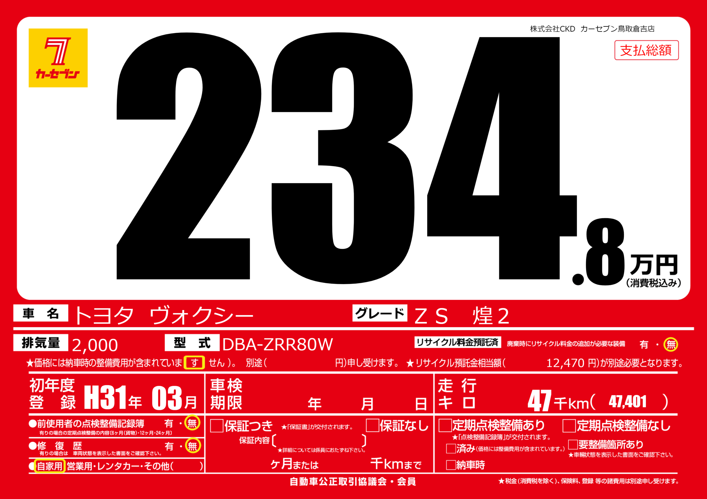| 車名 | トヨタ ヴォクシー | グレード ミッション 排気量 |