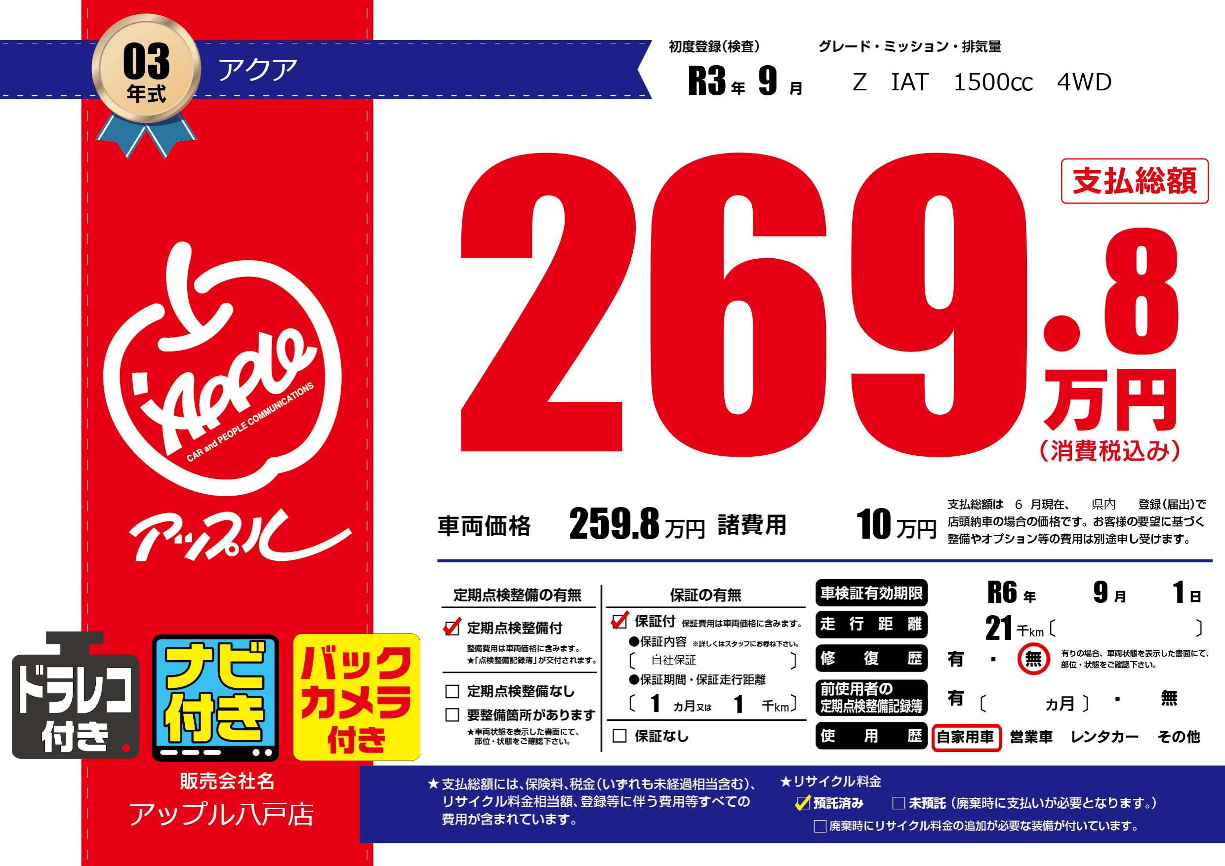 なし | 車検制限 | R6年9月1月 |
