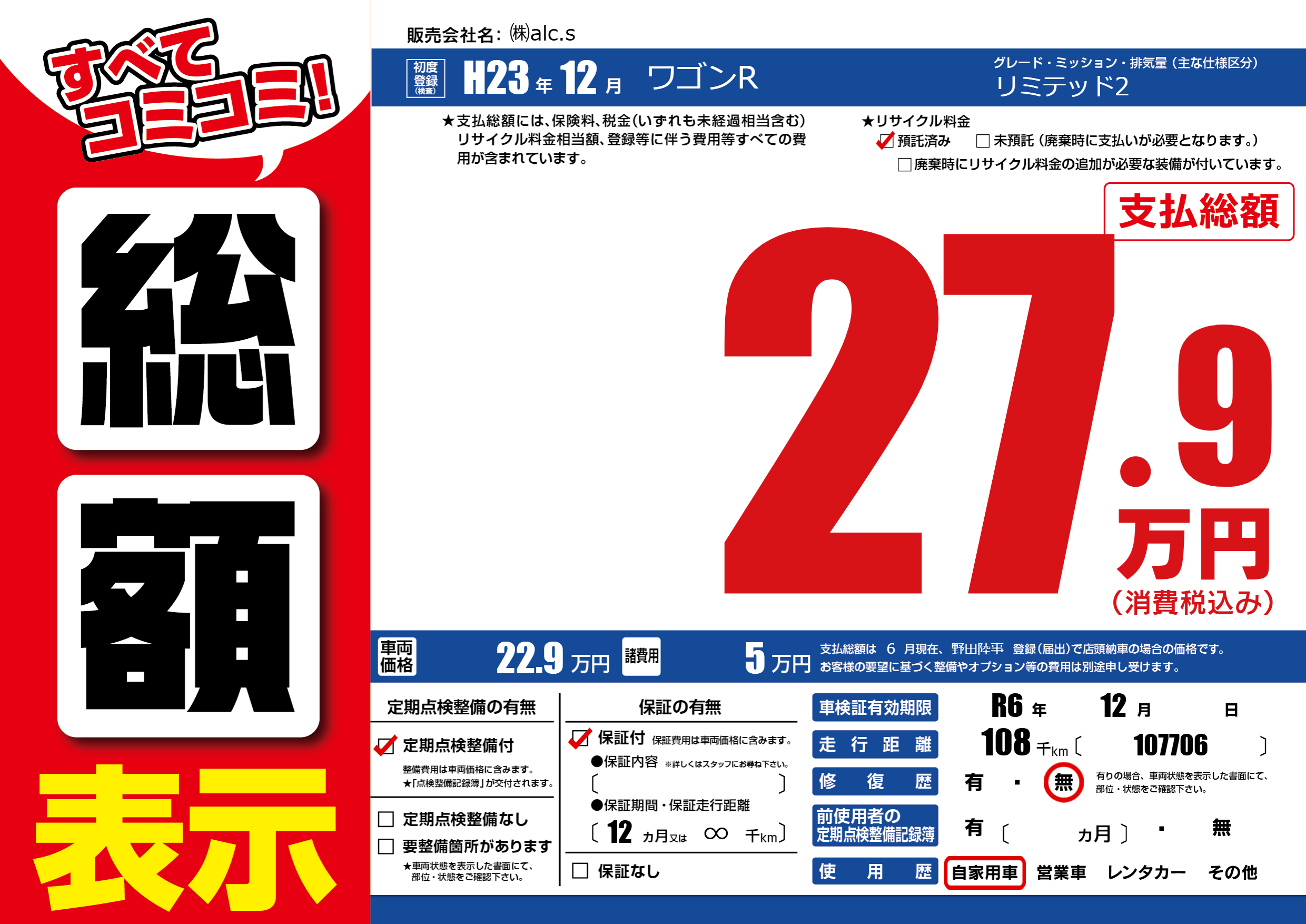 なし | 車検制限 | R6年12月---月 |