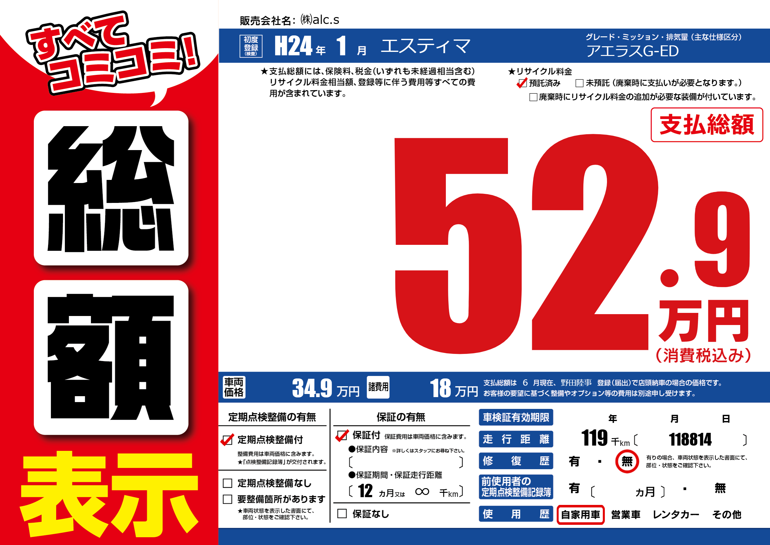 | 車名 | エスティマ | グレード ミッション 排気量 |