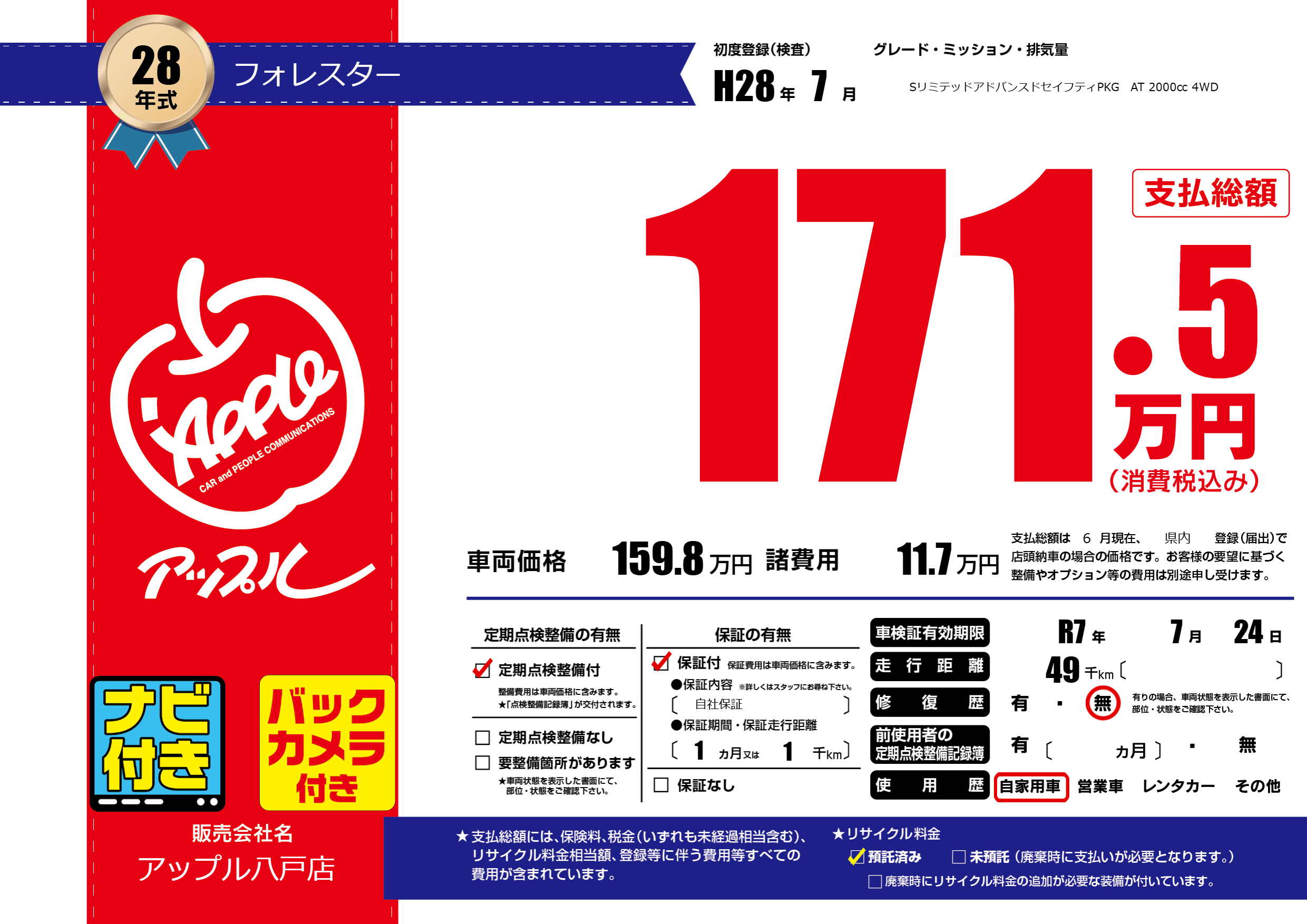 | 走行キロ | 4.9万km | 初年度登録 | H28年7月 |