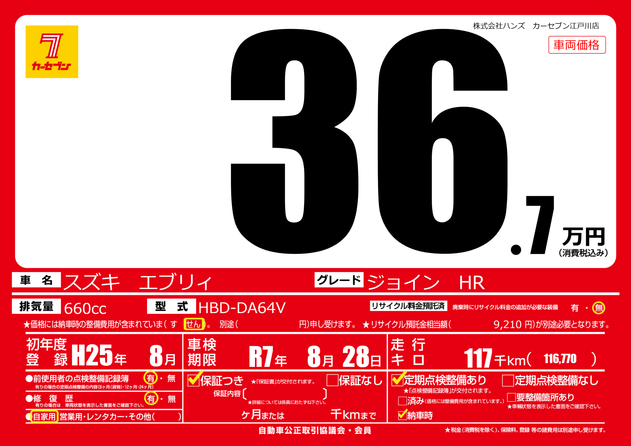 | 車名 | スズキ エブリィ | グレード ミッション 排気量 |