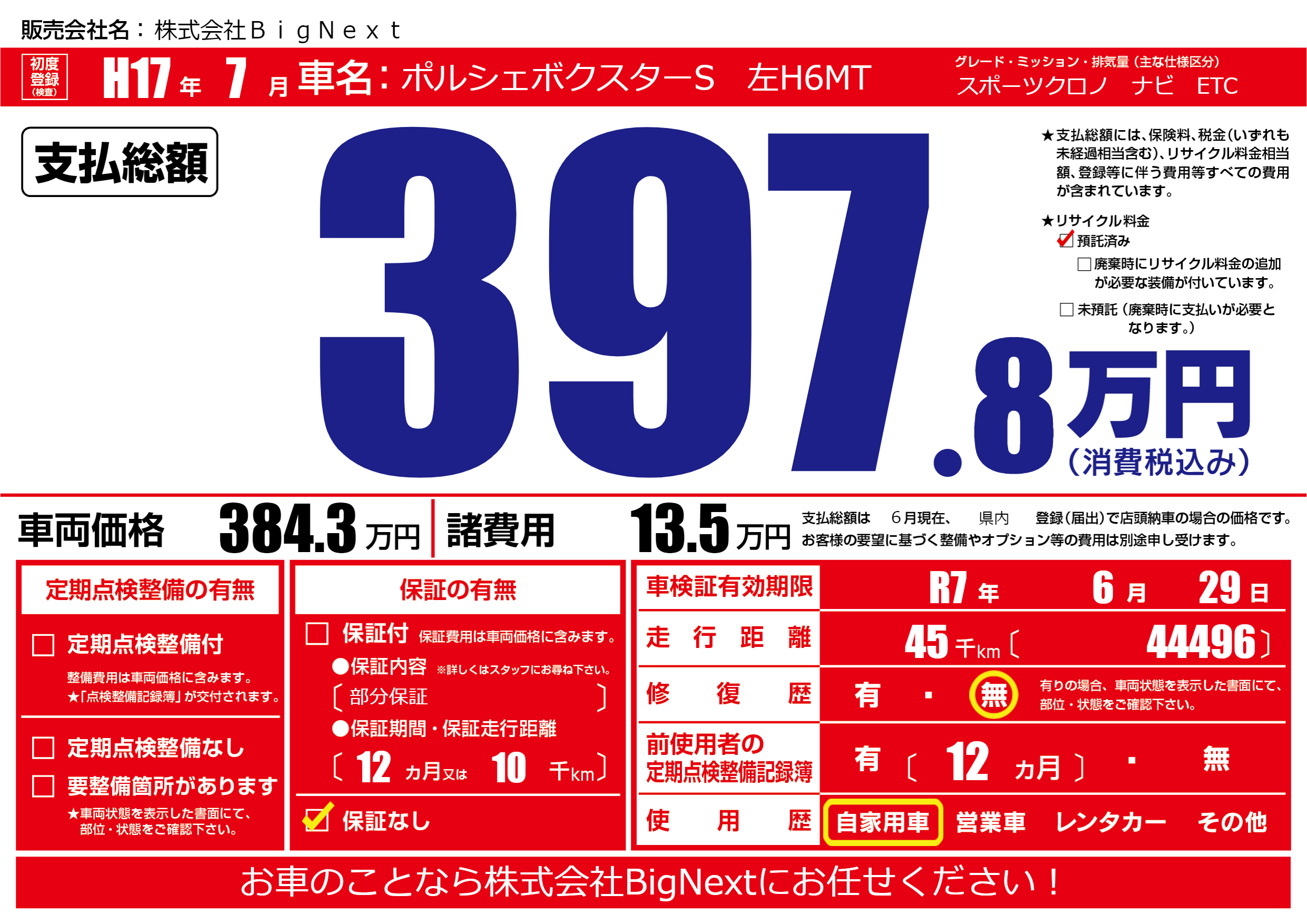 | 車検制限 | R7年 6月 29日 | ||
