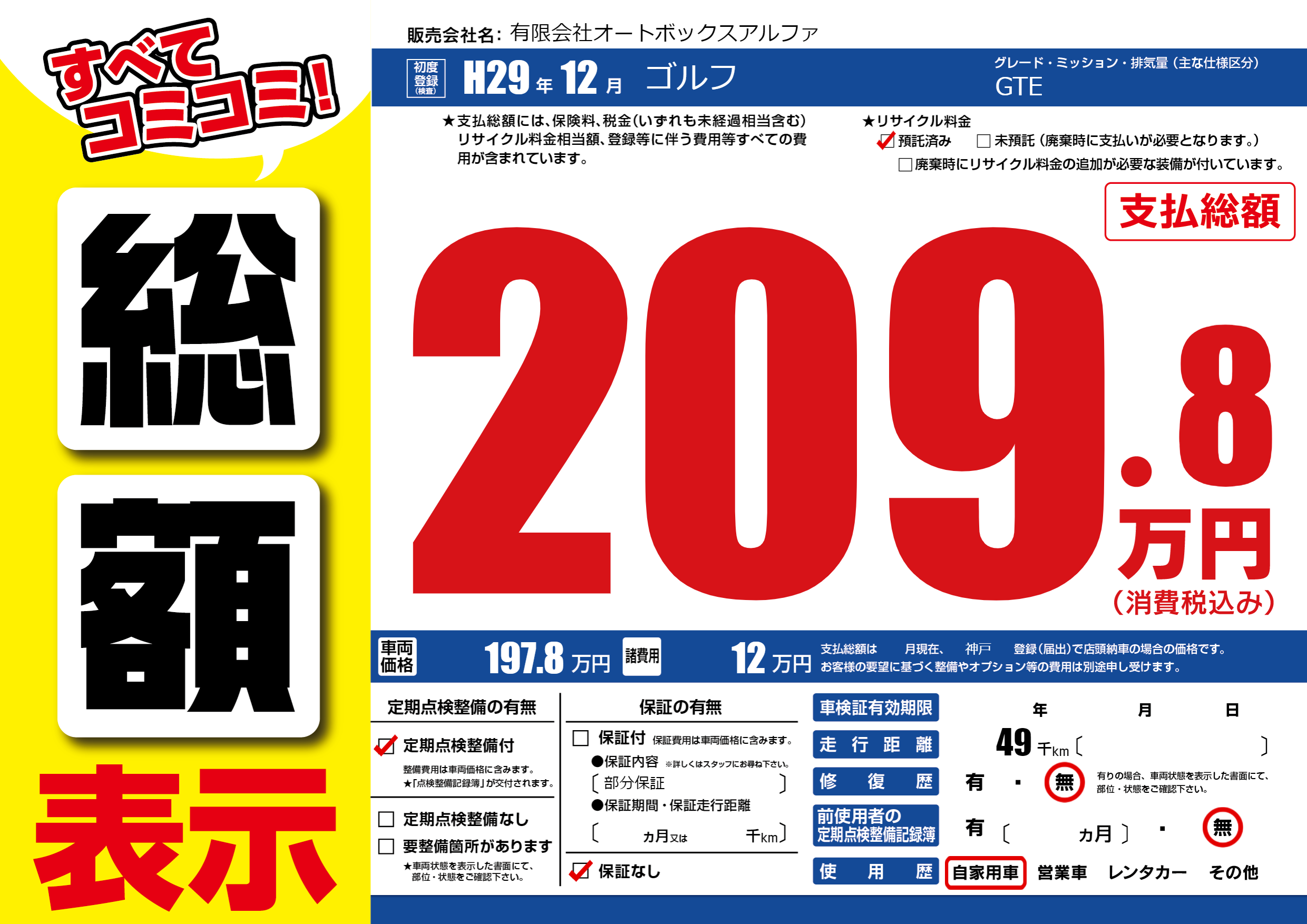 保証なし 保証内容(部分保証) ---ヶ月または()千kmまで |