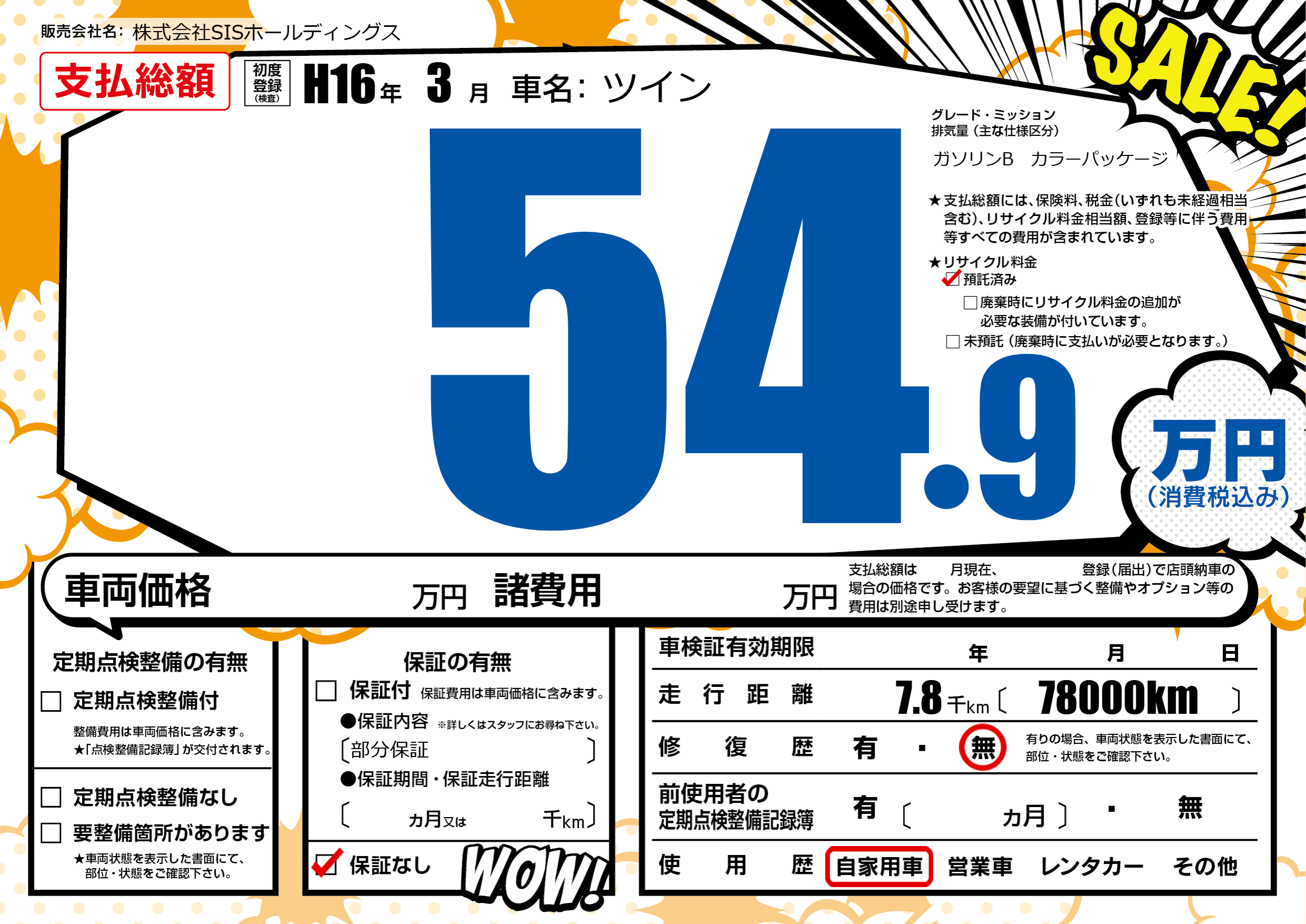 | 車名 | ツイン | グレード ミッション 排気量 |