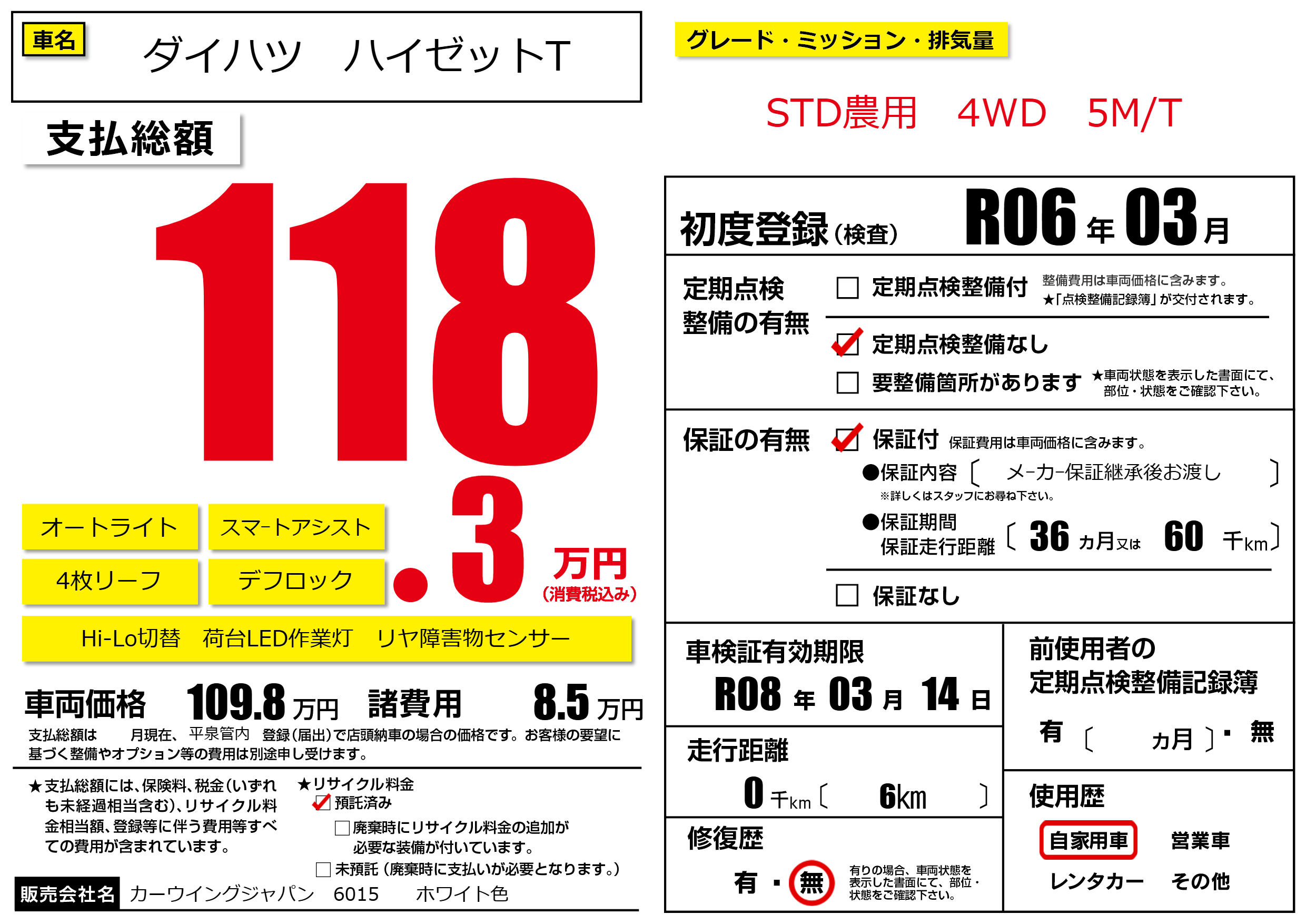 | 車名 | ダイハツ ハイゼットT | グレード ミッション 排気量 |