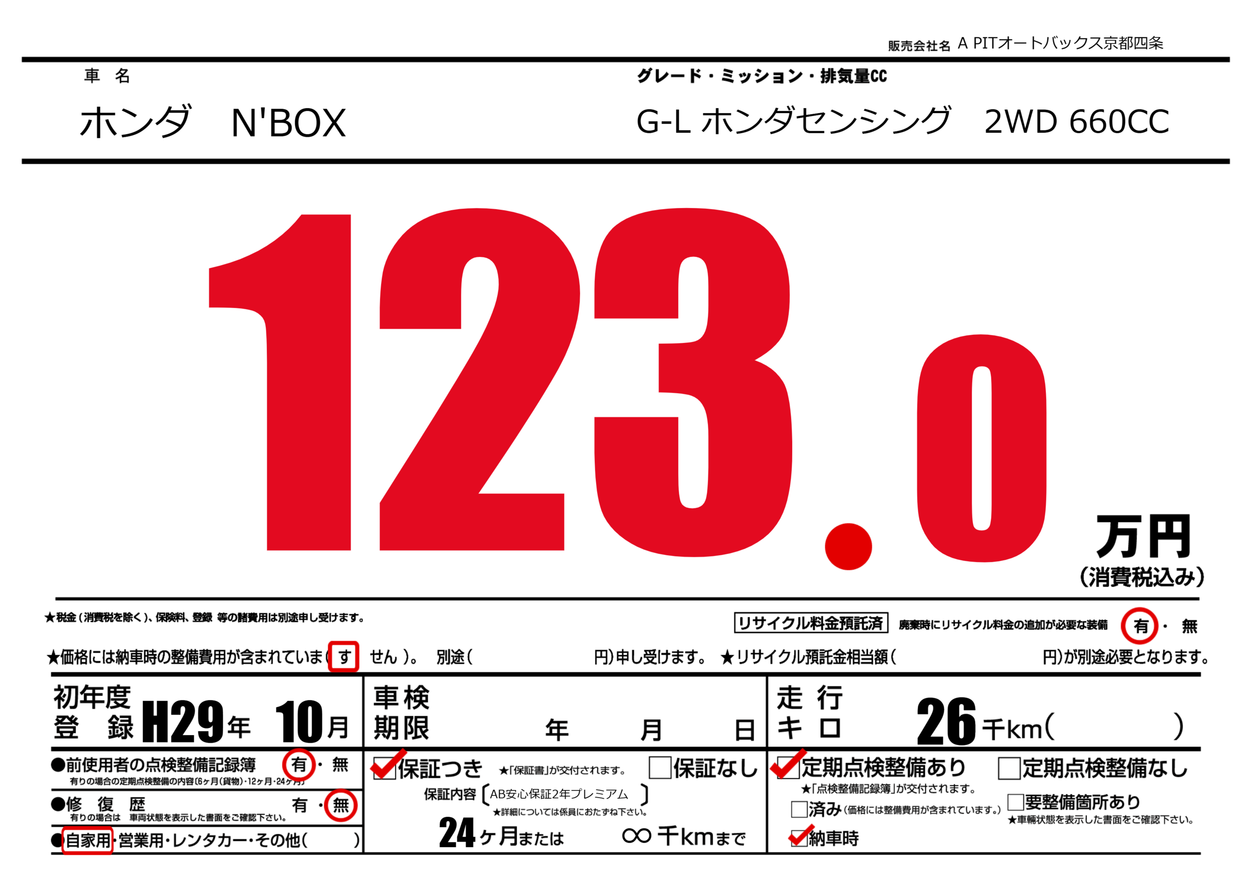 | 車名 | ホンダ N'BOX | グレード ミッション 排気量 |