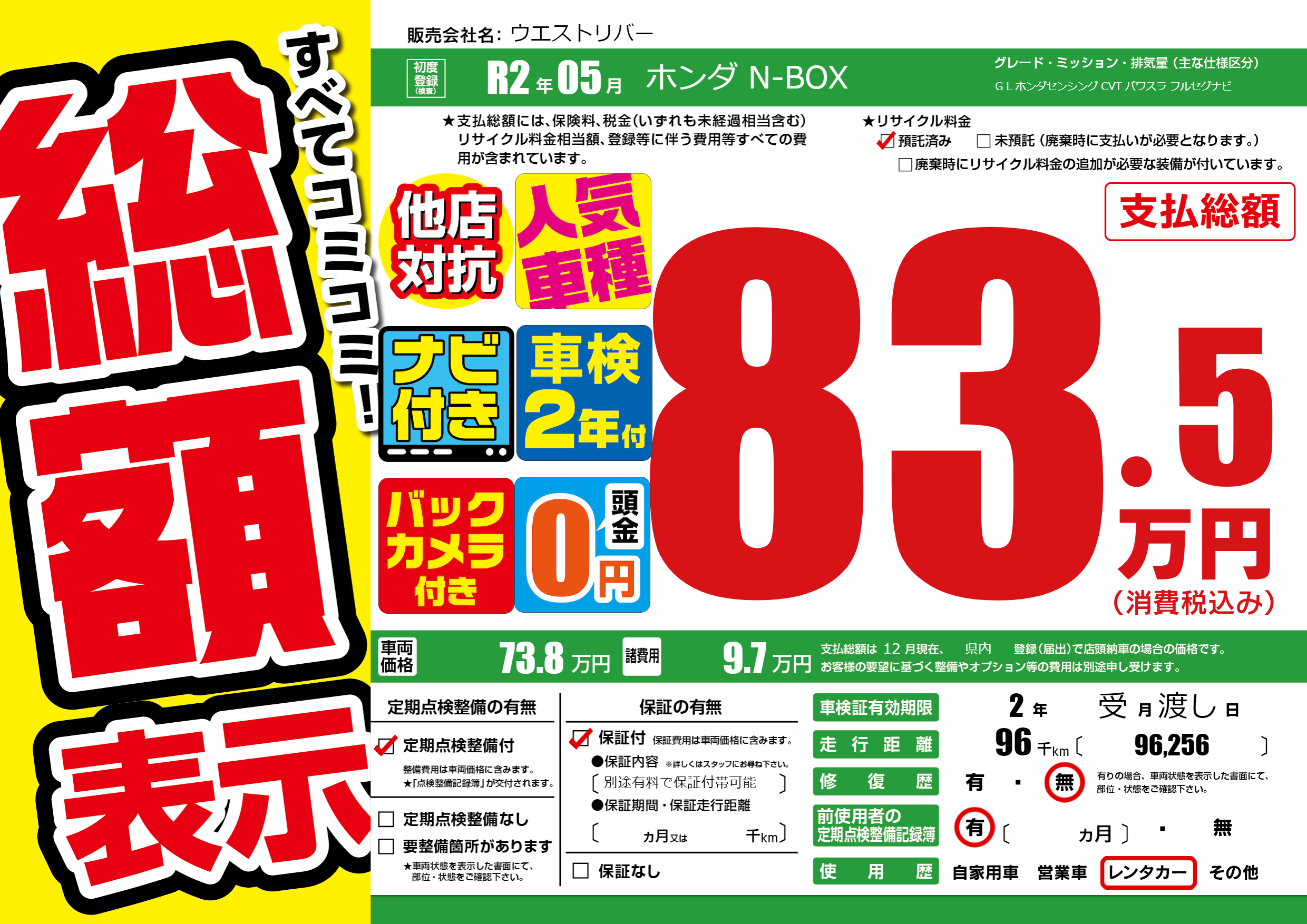| 走行キロ | 9.6万km | 初年度登録 | R2年05月 |