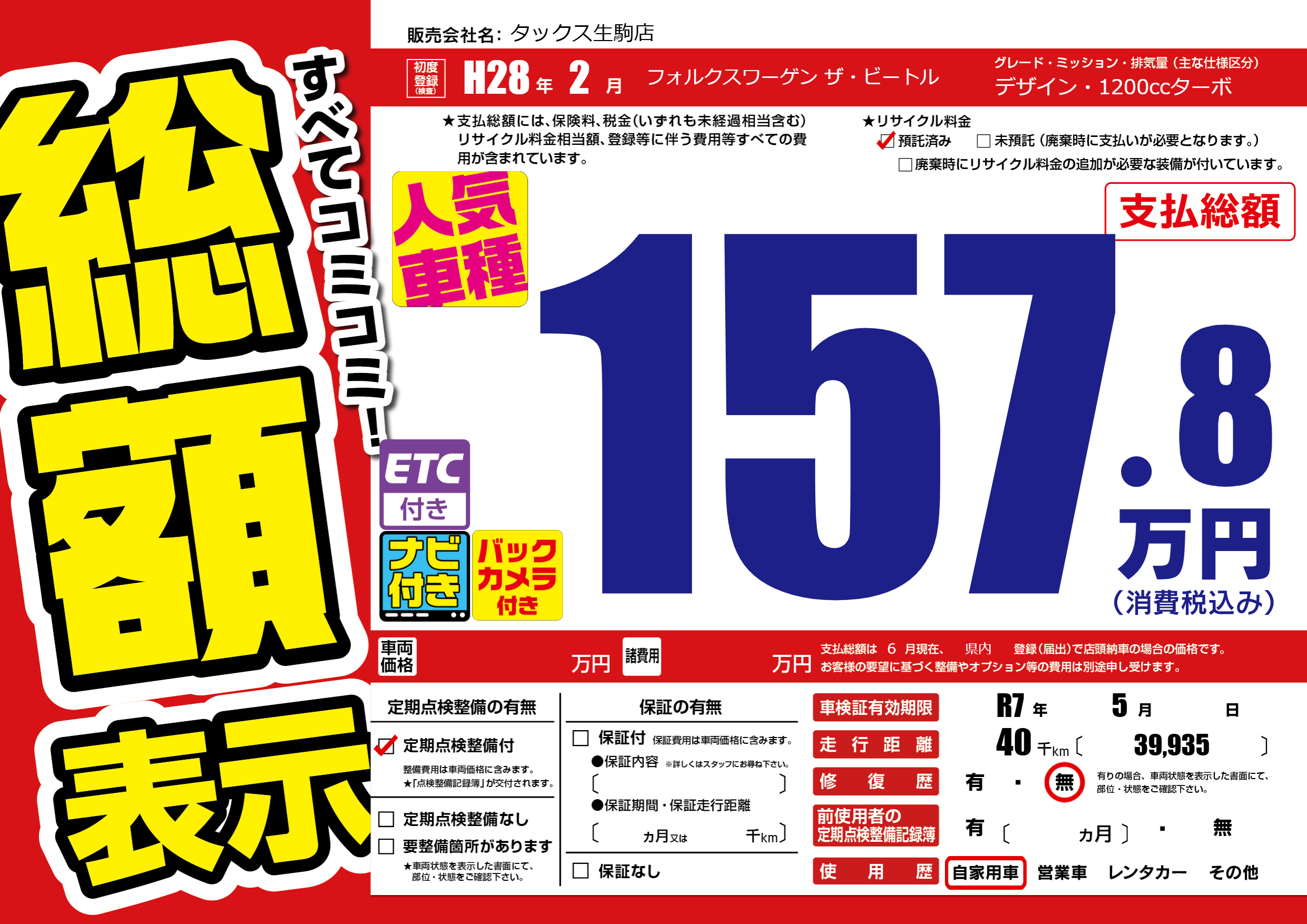 | 車名 | フォルクスワーゲン ザ・ビートル | グレード ミッション 排気量 |