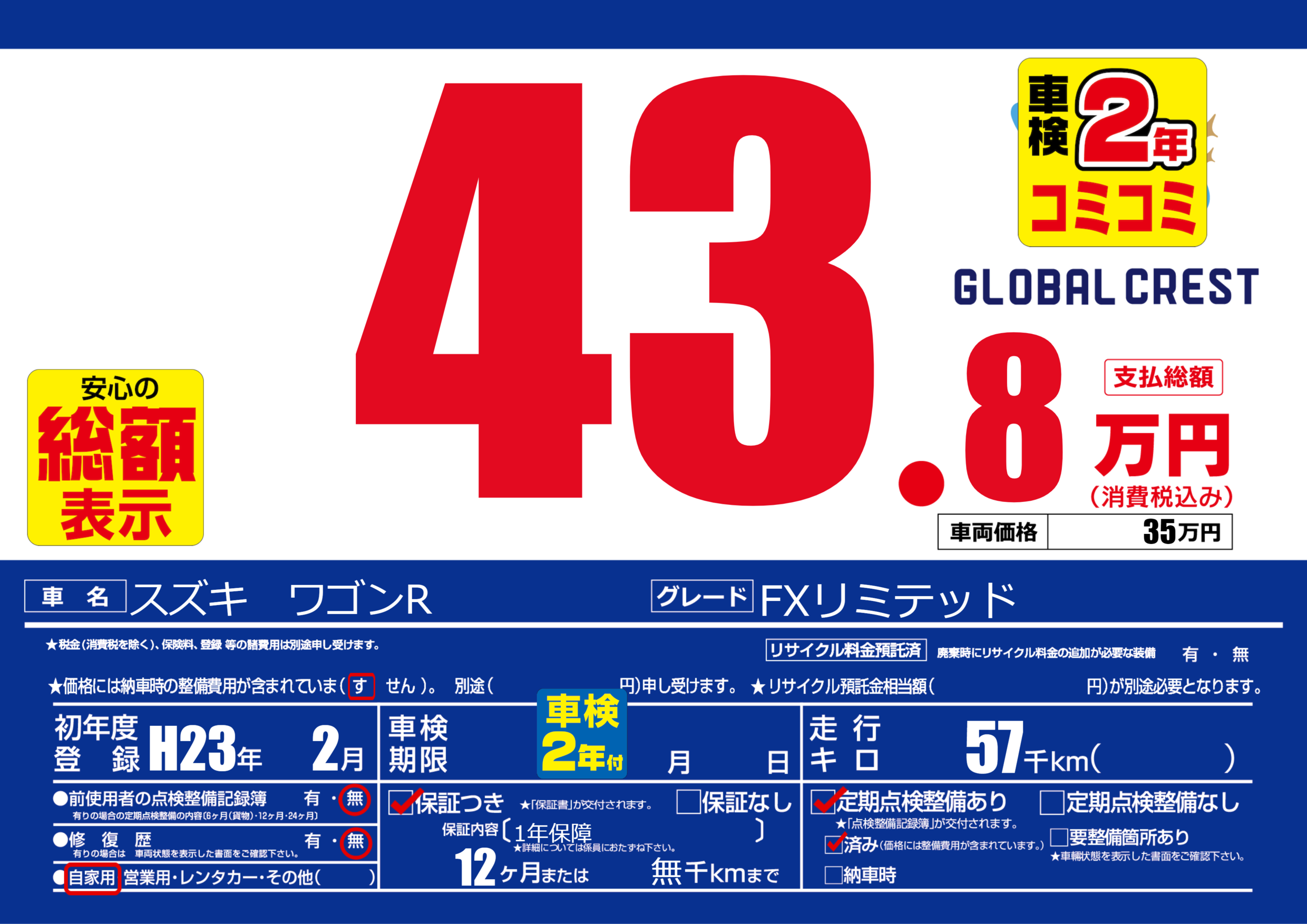 | 車名 | スズキ ワゴンR | グレード ミッション 排気量 |