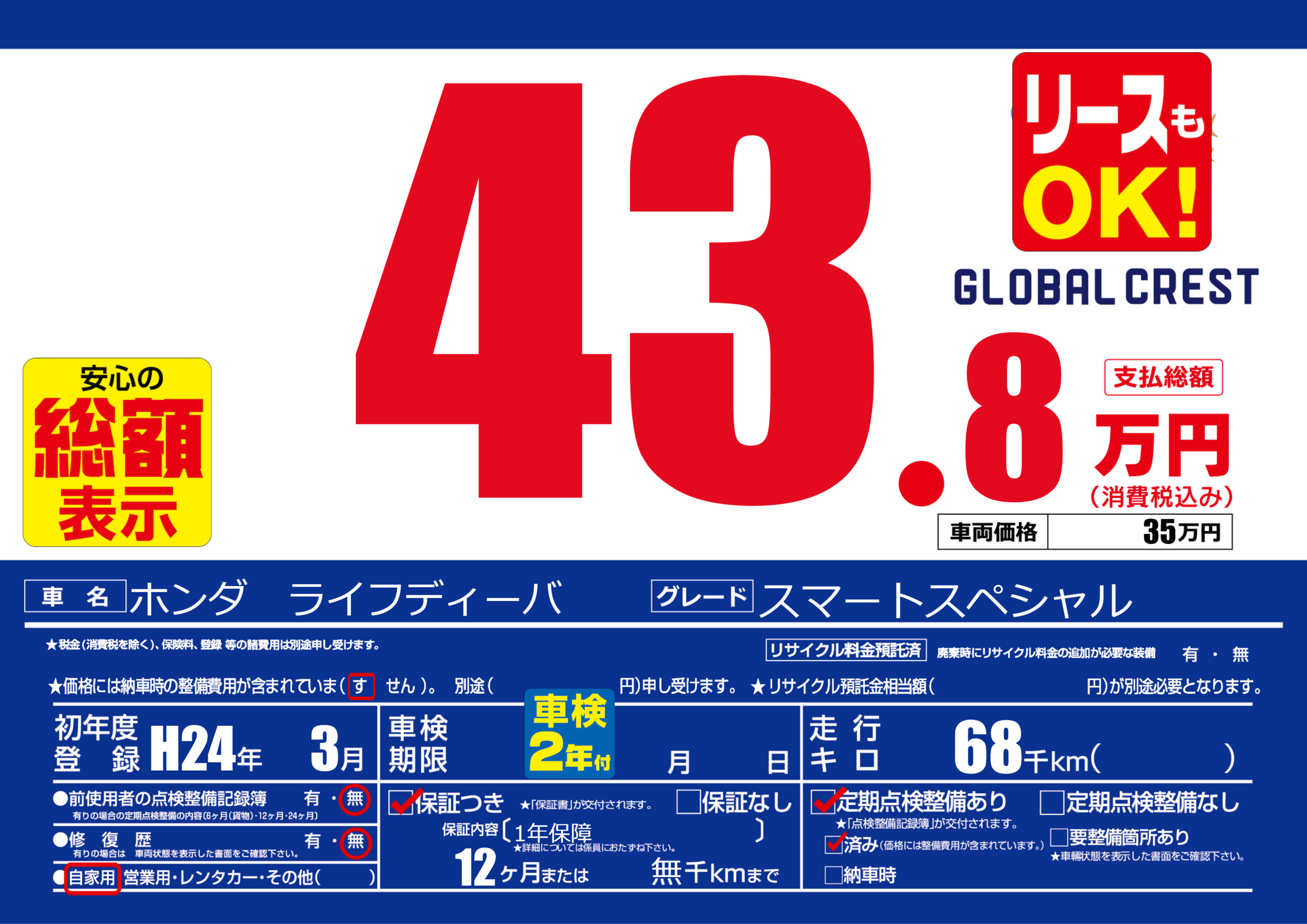 | 車名 | ホンダ ライフディーバ | グレード ミッション 排気量 |