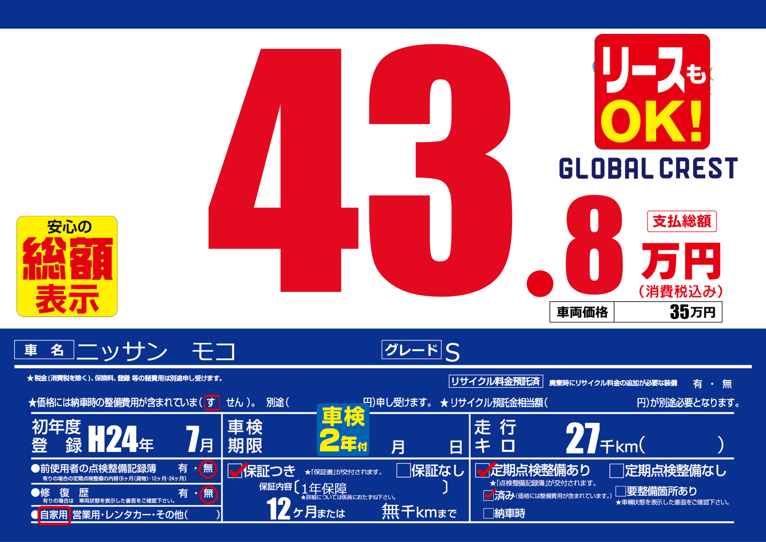 | 定期点検整備 | 定期点検整備あり 定期点検整備済み | ||