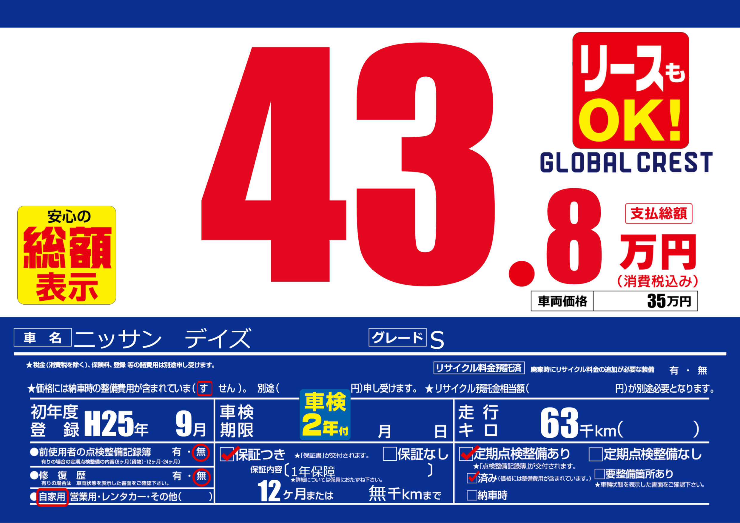 | 車名 | ニッサン デイズ | グレード ミッション 排気量 |