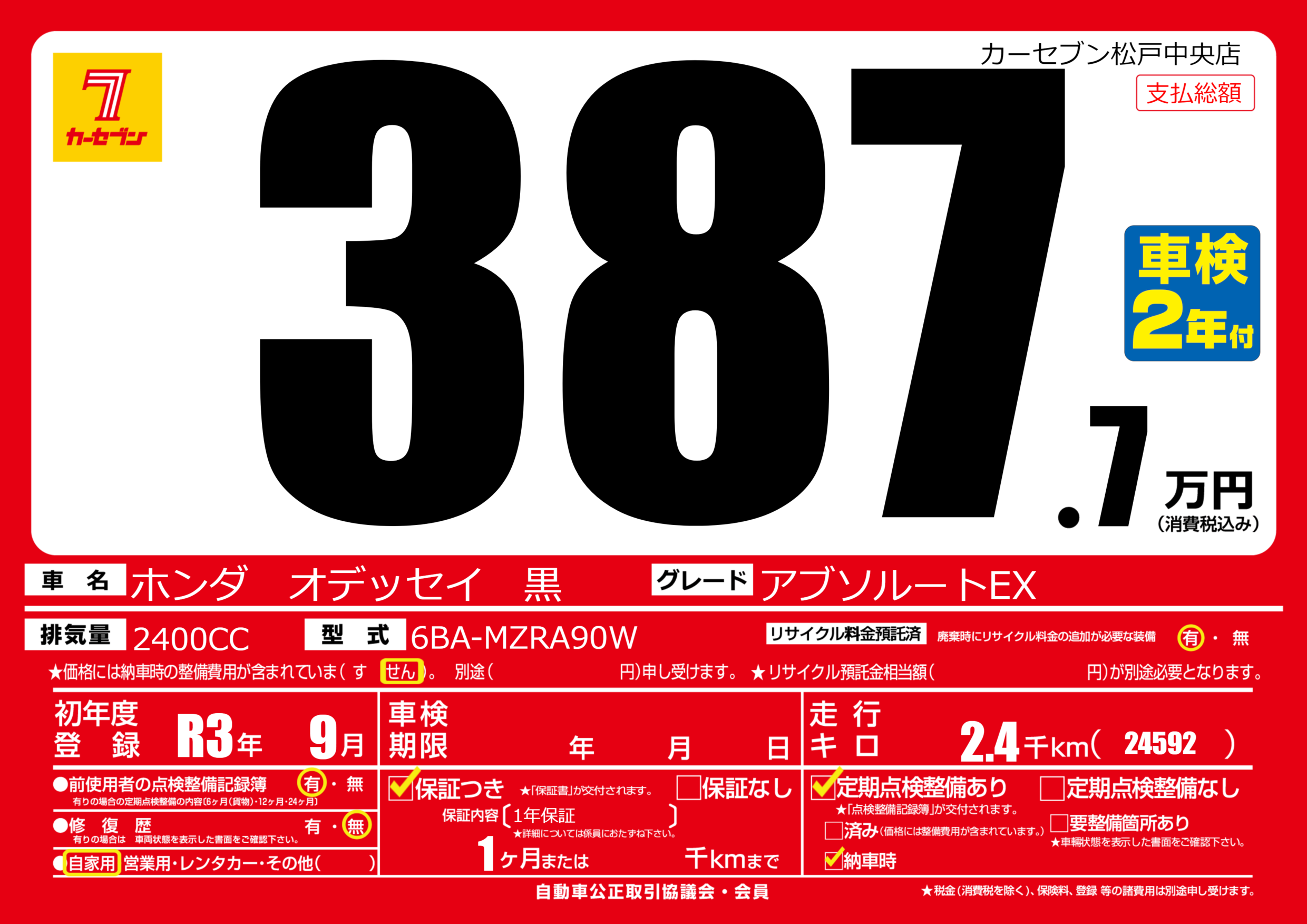 | 走行キロ | 0.2万km | 初年度登録 | R3年9月 |