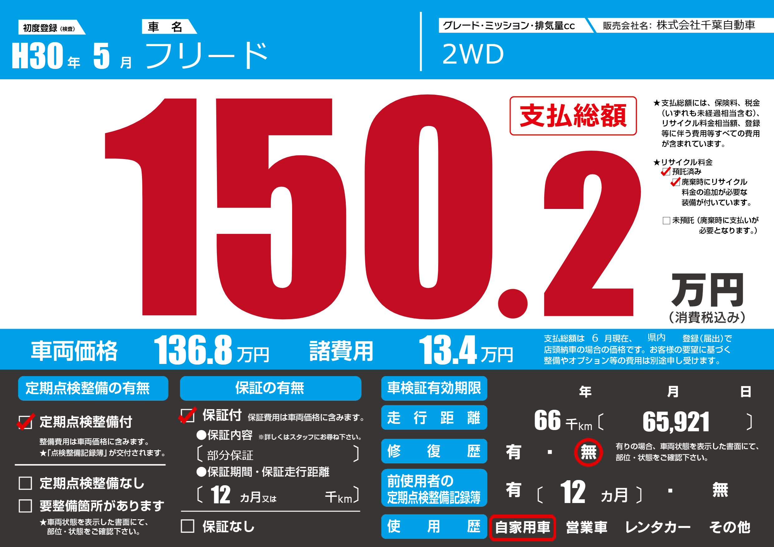 | 走行キロ | 6.6万km | 初年度登録 | H30年5月 |