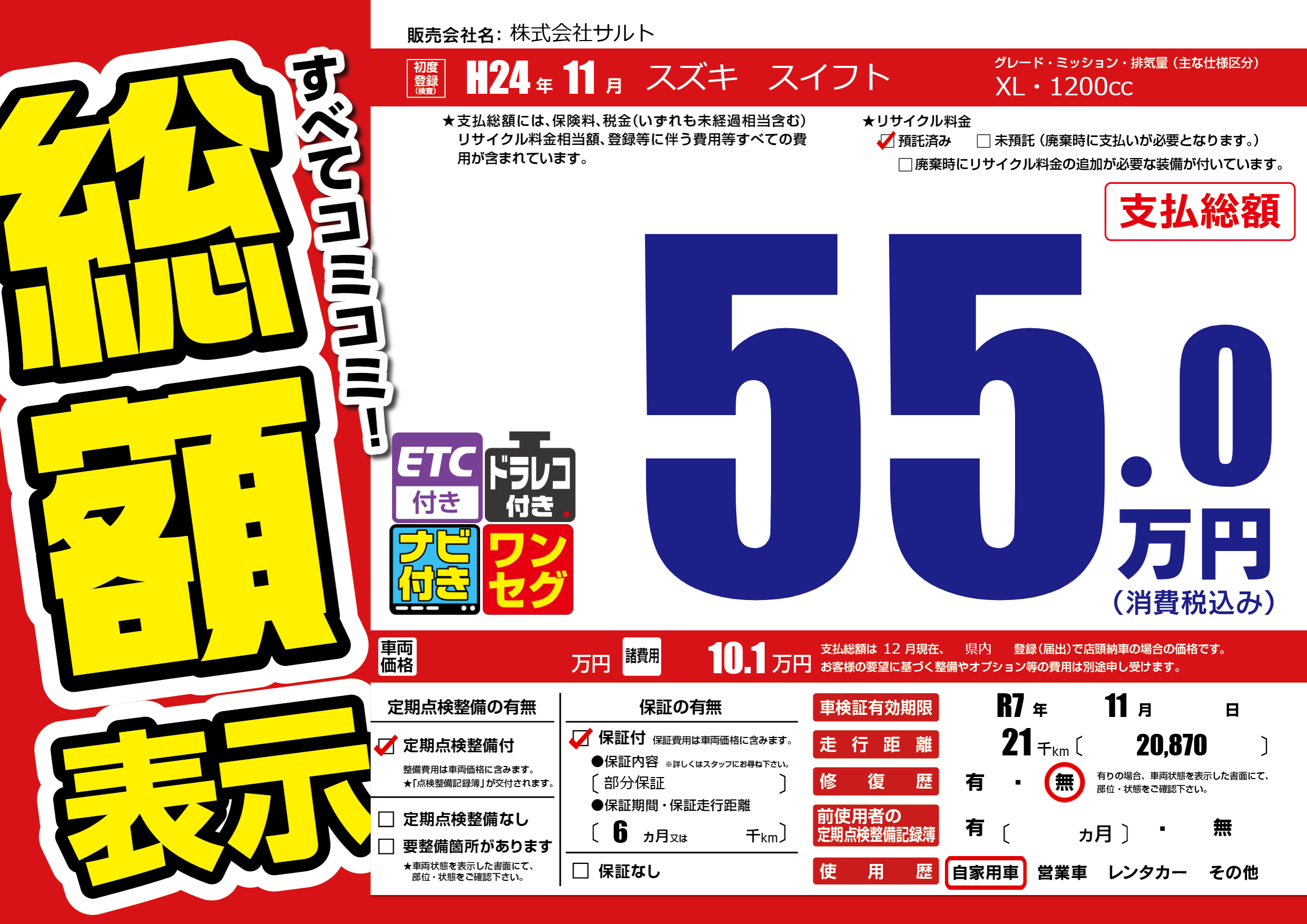 | 車名 | スズキ スイフト | グレード ミッション 排気量 |