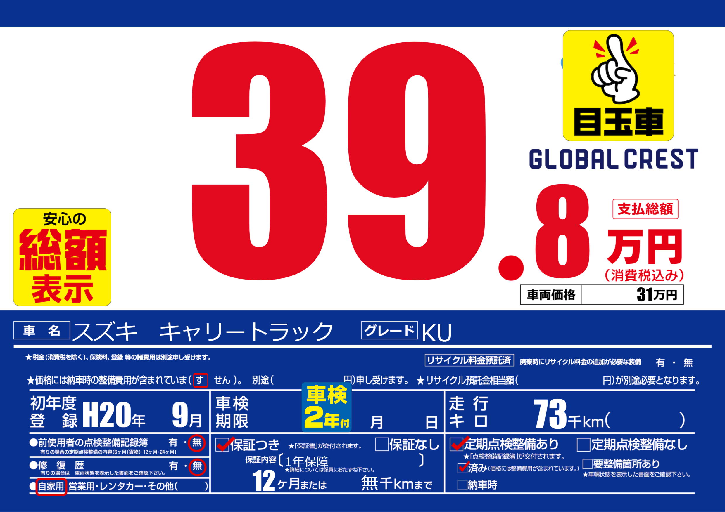 | 定期点検整備 | 定期点検整備あり 定期点検整備済み | ||