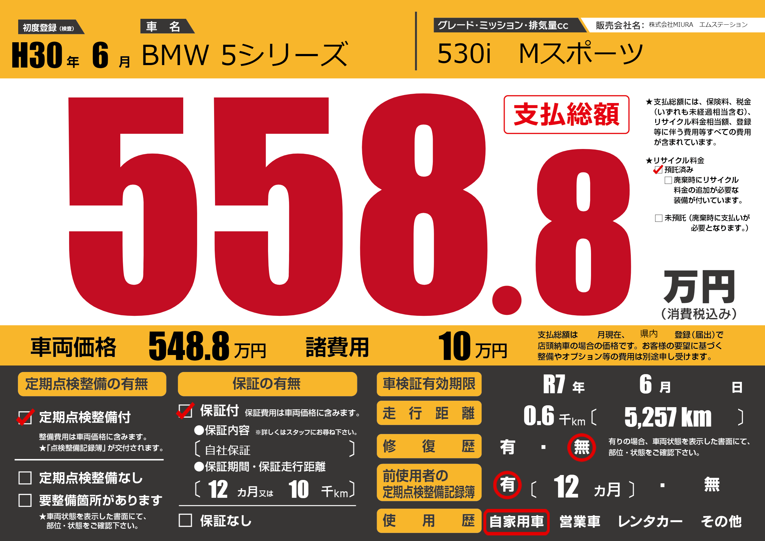 | 車名 | BMW 5シリーズ | グレード ミッション 排気量 |